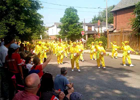 七月一日,法轮功学员应邀参加了多伦多东约克区举行的加拿大国庆节庆祝活动。法轮功学员组成的腰鼓队和舞狮队参加了游行。