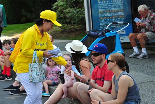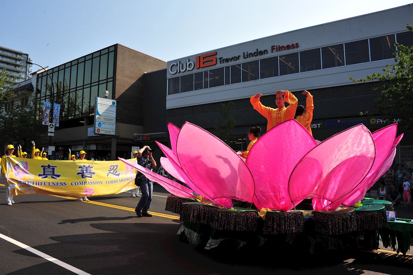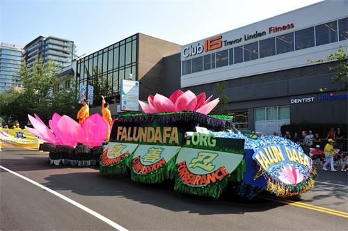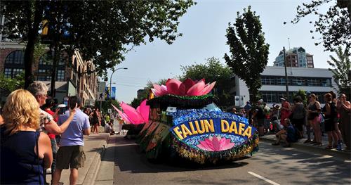 7月28日,天气炎热,温哥华地区连续多日高温并没有阻挡观众们的热情,很多民众在路边观看游行。法轮功学员的游行队伍伴随着祥和的音乐走来,尤其是装饰有莲花瓣的以“真善忍”为主题的花车成为观众们喜爱的热点。多名摄影师数次走近花车在不同角度拍摄花车和在花车上演示法轮功功法的学员。