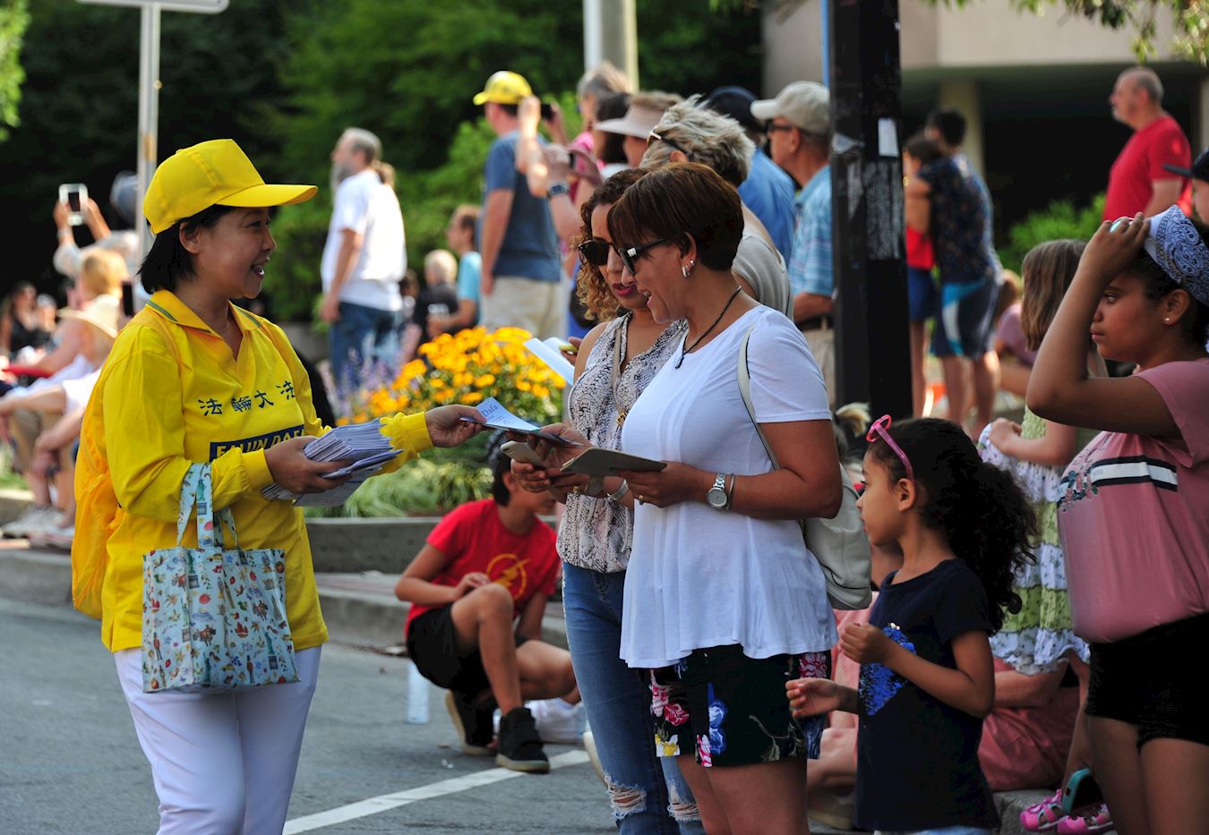 随着法轮功学员们一路走来,不时可以听到人们的赞叹,观众纷纷拿了法轮功真相资料,在路边阅读,还有很多人拍摄法轮功学员的游行队伍。
