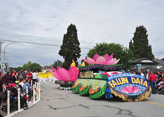 七月一日,法轮功学员参加了列治文市加拿大国庆游行,受到观众热烈欢迎。有华人走近法轮功学员游行队伍,问候:“你们辛苦了!”