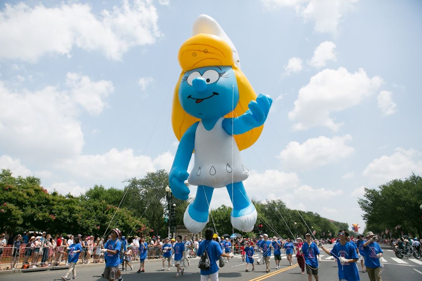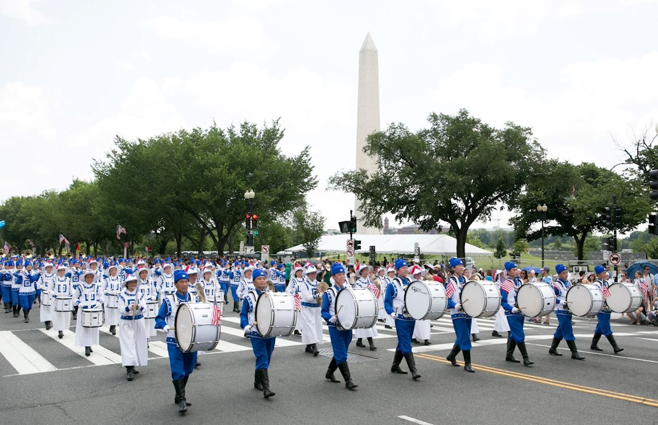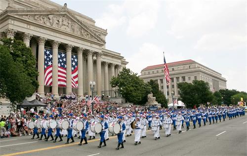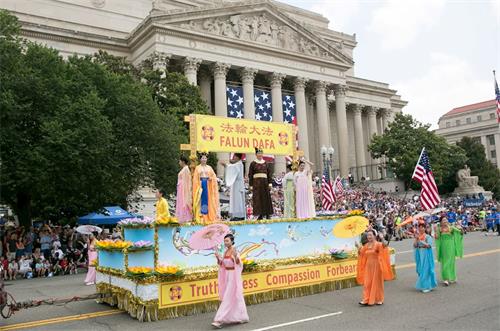 上午十一点四十五分,游行队伍从宪法大道和七街交界的起点出发。法轮功学员的游行队伍由天国乐团和花车组成,还有二十五位法轮功学员受主办方之邀手持巨大的卡通人物气球。天国乐团成员身着色彩清新明亮、设计新颖的传统宫廷乐团服饰,格外醒目,与众不同,成为游行中一道独特景观。他们演奏了《法轮大法好》、《神圣的歌》、《法正乾坤》、《凯旋》、《送宝》、《法鼓法号震十方》、《法轮圣王》、《佛恩圣乐》八首原创乐曲,还特别为美国独立日游行准备了一曲《星条旗永不落》。在十几个街区的游行路线沿途,层层叠叠的民众为法轮功学员鼓掌喝彩。