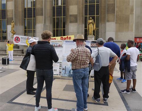 游人中也有大陆游客,他们有的仔细看真相展板,用手机拍摄展板上的内容。有的在听了法轮功学员关于中共暴行的讲解后,退出了中共党、团、队组织。