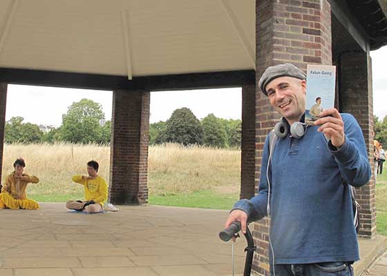 伦敦海德公园里的一个砖木结构的角亭――白金山避风亭被法轮功学员选做义务教功点。三年来,先后有几位法轮功学员轮流照看这个教功点,免费义务教功。