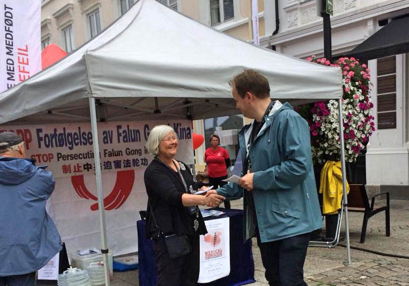 善良的英格丽女士表示无法容忍中共的暴行,她激动地表示:“太可怕了,简直就是惨无人道。感谢你们来到这里告诉我们这些,我一定会把这个事情告诉我的亲朋好友! 我的儿子是一名外科医生,住在斯塔万格并在那里小有名气。我肯定会告诉他在中国发生的活摘人体器官的事情……”