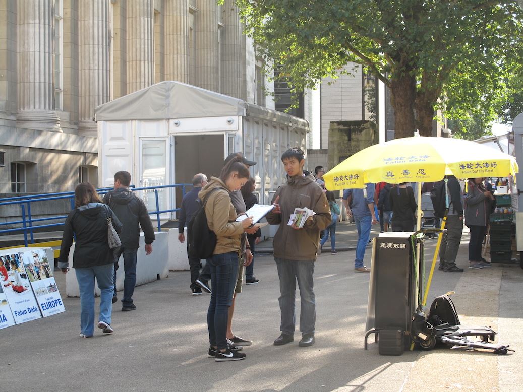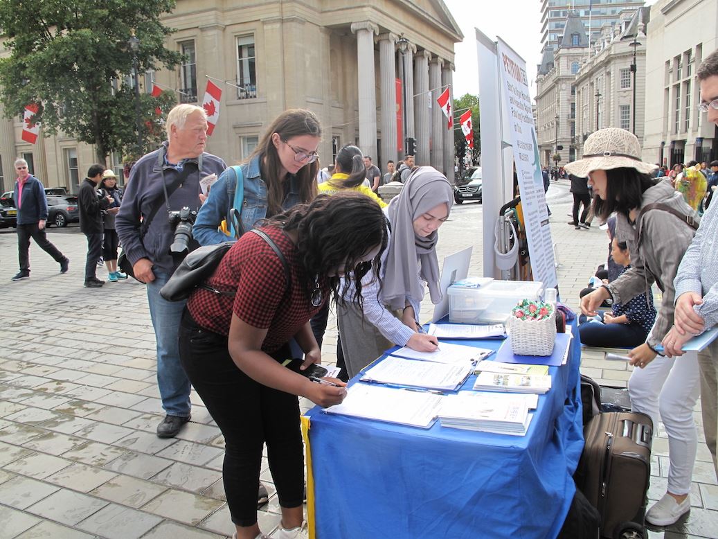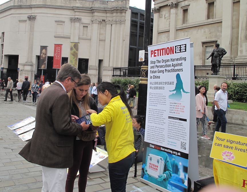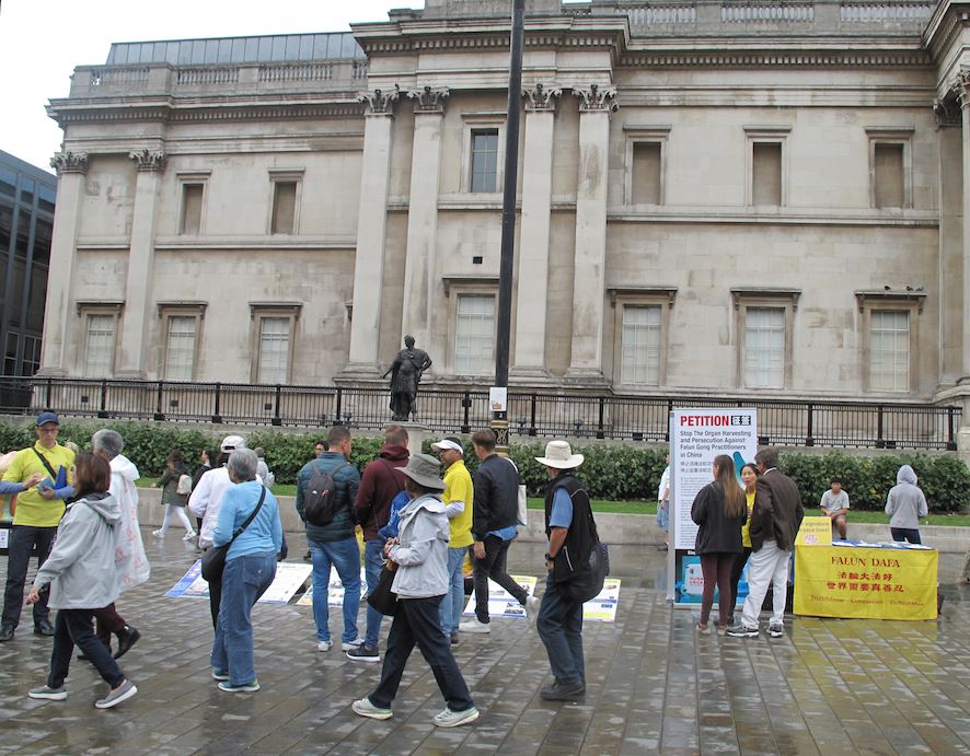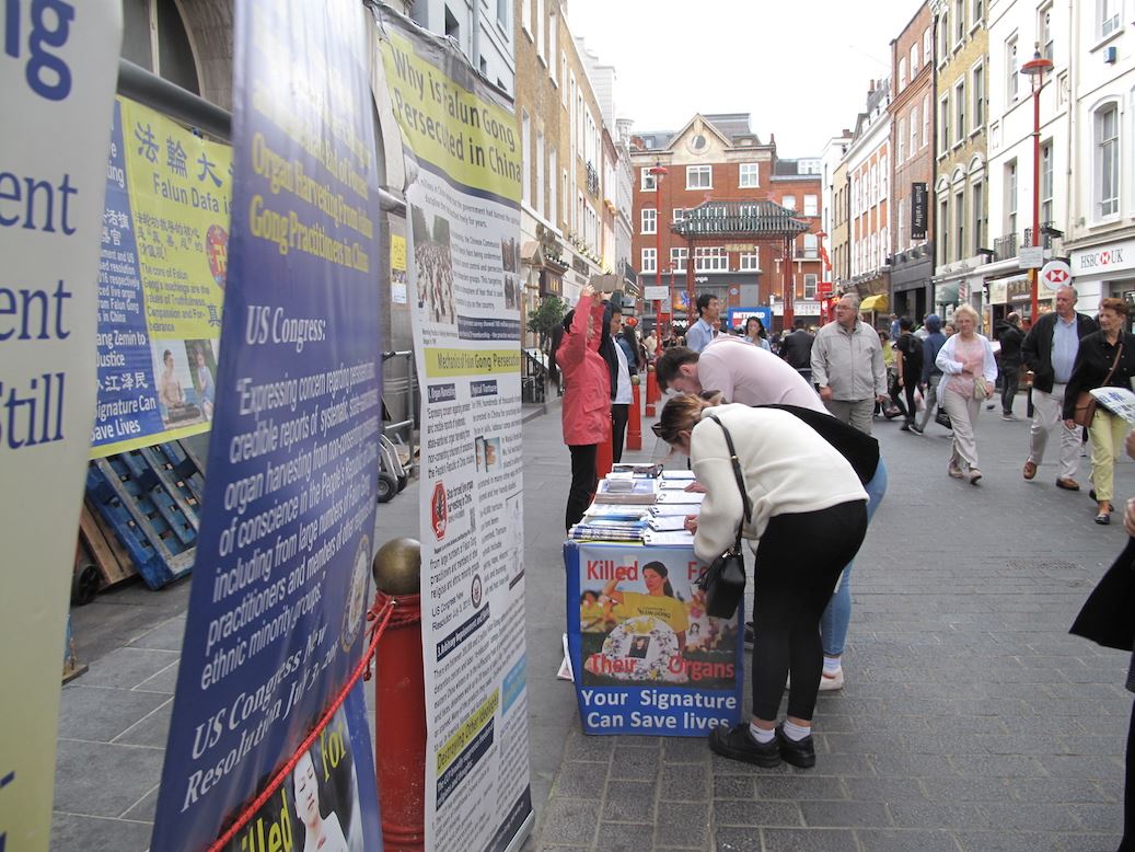 当天伦敦是阵雨天气,在唐人街上,法轮功学员照常炼功、发传单、讲真相。风雨中,法轮功学员“你的签名可以挽救生命(Your Signature Can Save Life)”的呼唤依然清晰,吸引路人目光,不断有人驻足观看真相信息、接过真相传单、在要求“停止活摘法轮功学员器官停止迫害法轮功”的反迫害征签表上签名,主动签名者中有人说他们刚刚在大英博物馆门前看到了同样的信息。