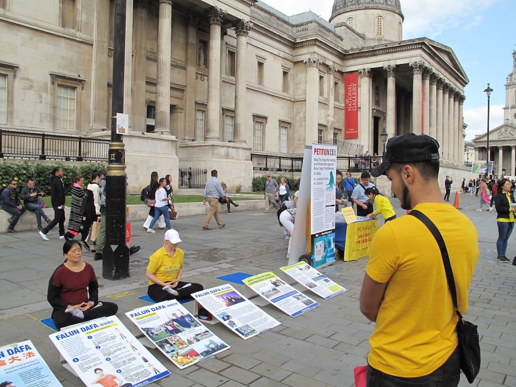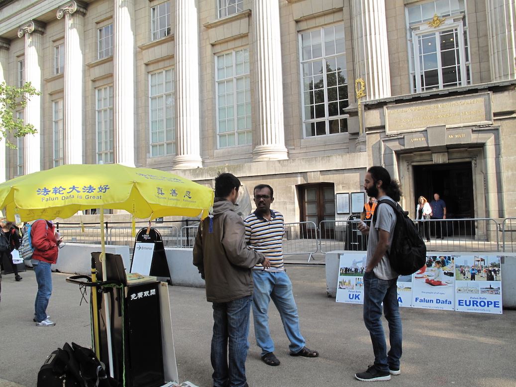 在距离鸽子广场乘车十几分钟的大英博物馆,法轮功学员也在南门和北门照常炼功、发真相传单、讲真相、征签反迫害。两位在博物馆北门前经过的两位伦敦男士在法轮功真相展板前驻足了解真相,其中一位是从事软件开发的辛格(Singh),另一位是位设计师,他们向法轮功学员问了两个问题:“中共为什么要置平和打坐的人于死地?中共对法轮功的残酷迫害还在发生吗?”