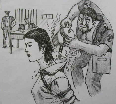 她自述:“这两个恶人一早上就用我的洗脸盆打来半盆开水泡红色的小朝天椒,又加了些盐,到晚上十点多钟犯人睡着了的时候,就在这个库房用泡好的辣椒水往我嘴里灌。……我紧紧的闭上嘴,她俩就拳打脚踢,把我打倒在地,恶人一只脚踩着左脸,右脸贴在地上,我的嘴巴踩开了个缝,另一个恶人趁机往嘴里灌。我在地上连滚带踹不停的挣扎着,一下就把盆打翻了,她俩气急败坏的说:撒了再泡,再灌。”