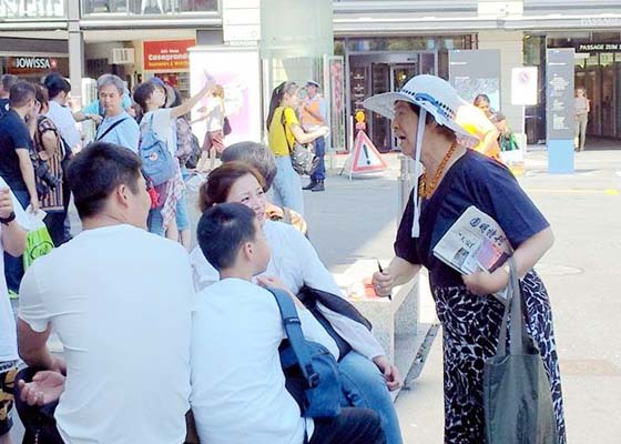 八月的瑞士卢塞恩景点,正值中国大陆游客在此旅游的高峰。法轮功学员抱着真相资料,迎着一群群大陆游客讲述法轮功真相,帮助人们退出中共相关组织。