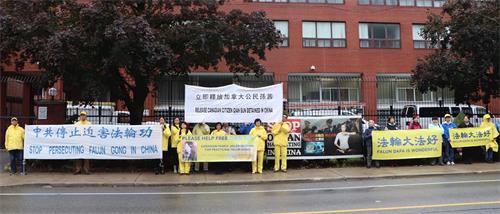 图1:九月十日,渥太华部份法轮功学员在中使馆前呼吁立即释放加拿大公民孙茜