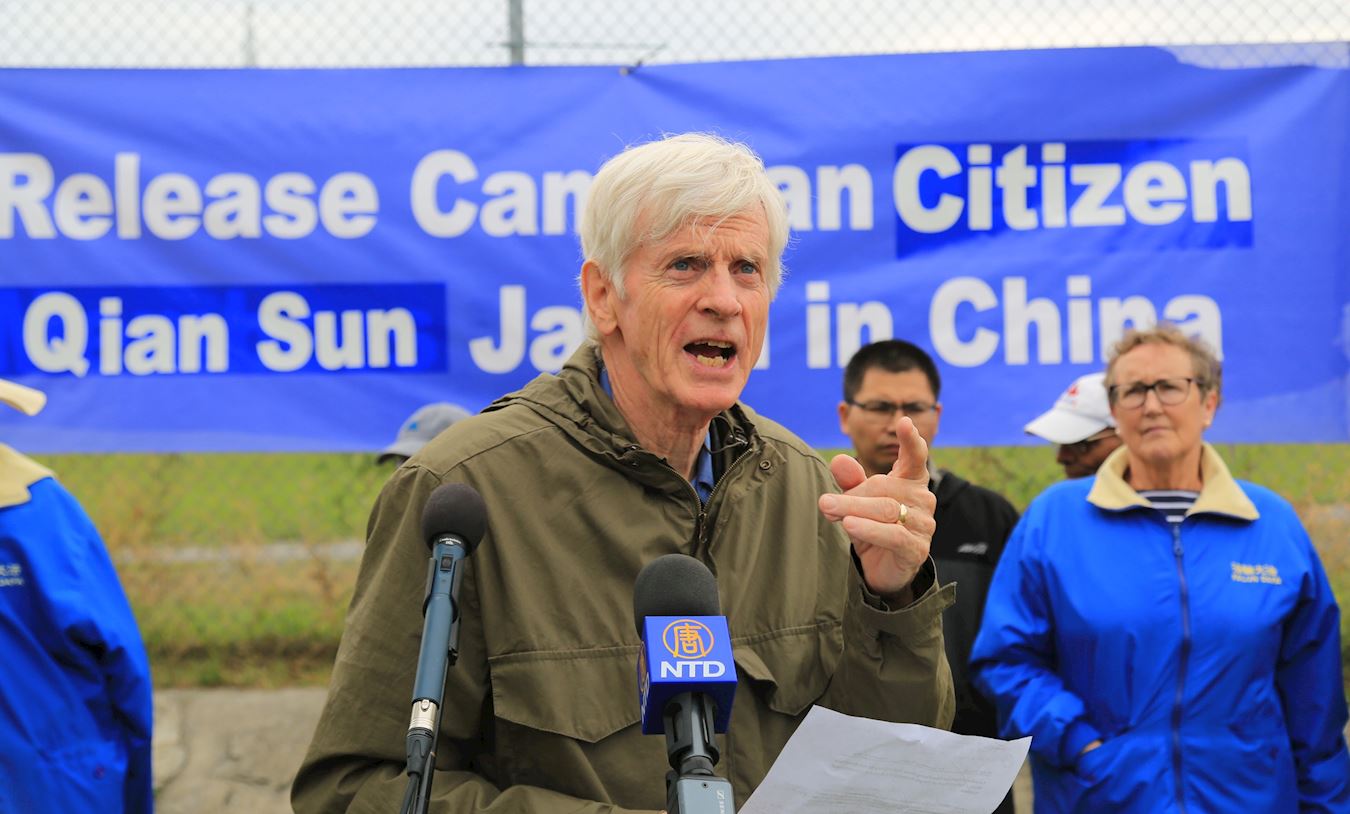 '图5:九月十日,前亚太司司长大卫·乔高加入到渥太华中使馆前法轮功学员抗议集会中,要求立即释放孙茜。'
