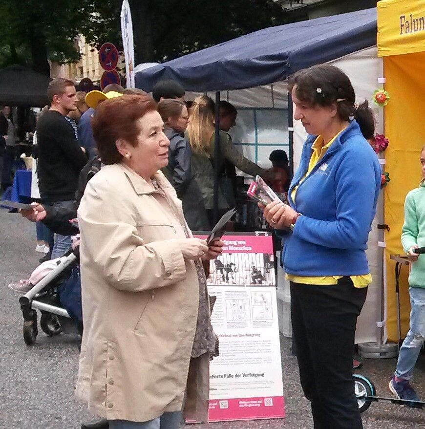 一名五十多岁的女士在接过传单后问:“这功法是为了疏解压力吗?”学员向她解释这是一种佛家的修炼方法后,第一次听到法轮功的她接连提出了许多问题,进一步了解功法和在中国遭受迫害的真相。她询问:“在哪里可以学功?”学员给了她一张印有汉堡炼功点信息的小卡片。她高兴地说:“太棒了!”离开时她向学员道谢并拿取了其它真相材料。