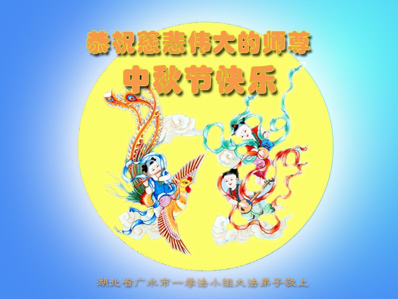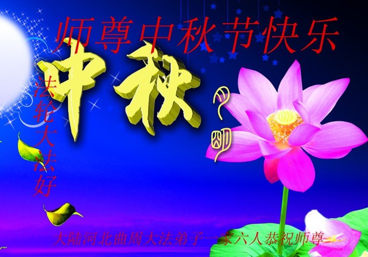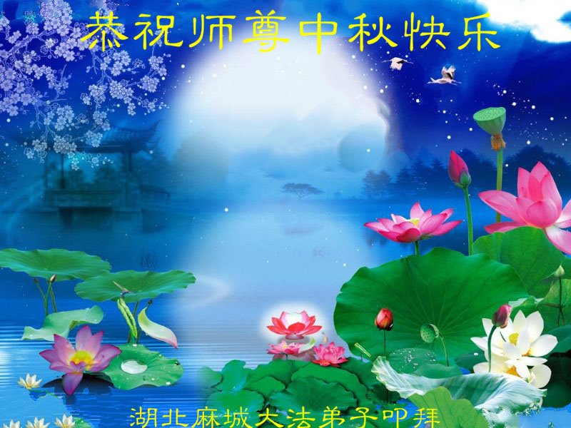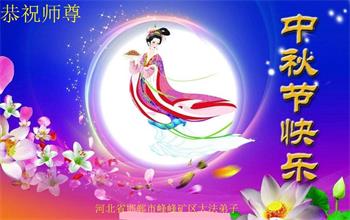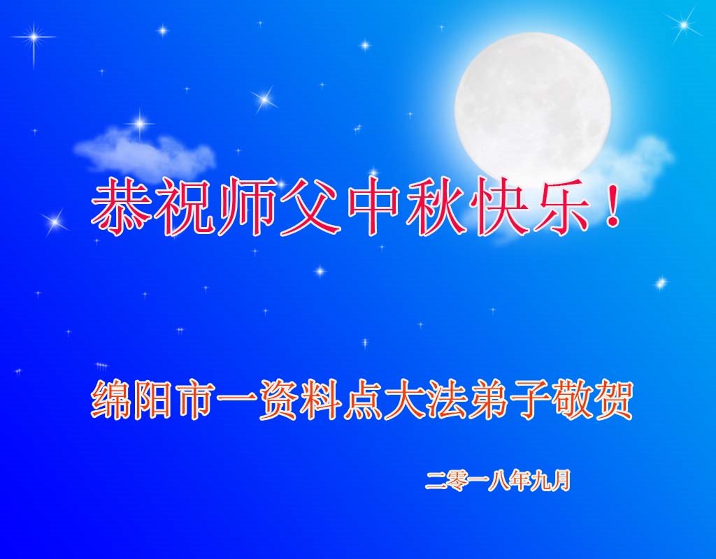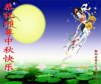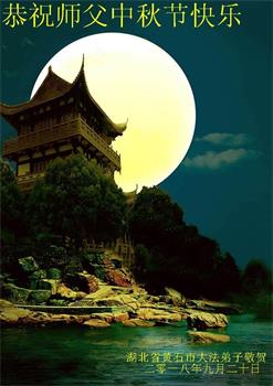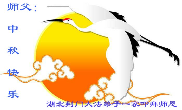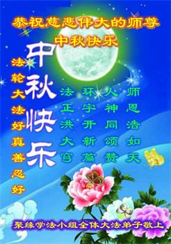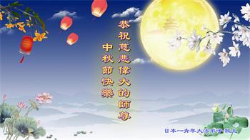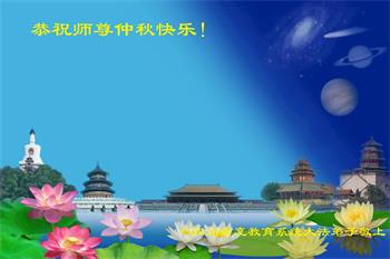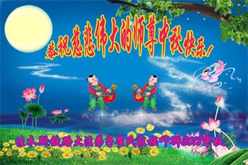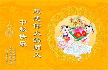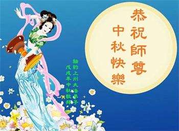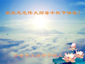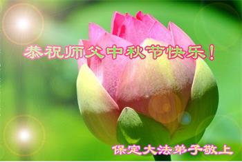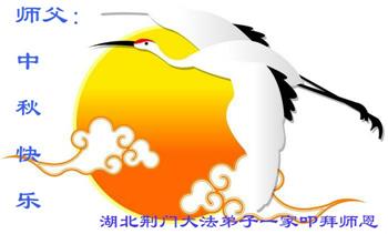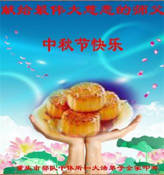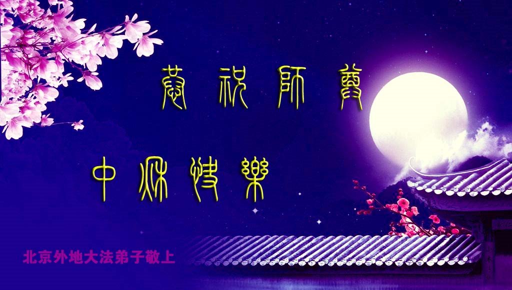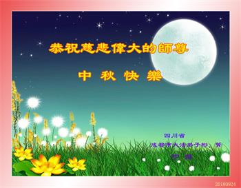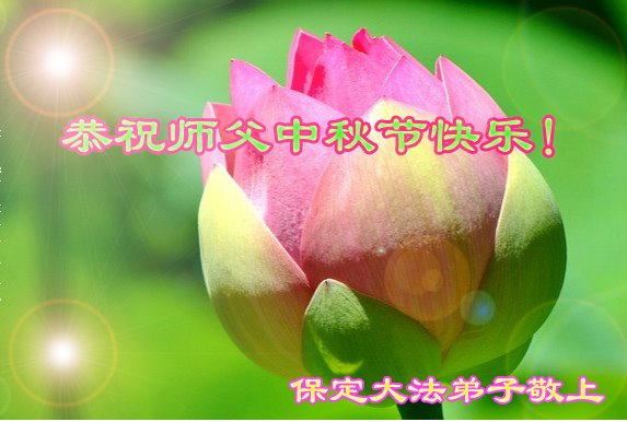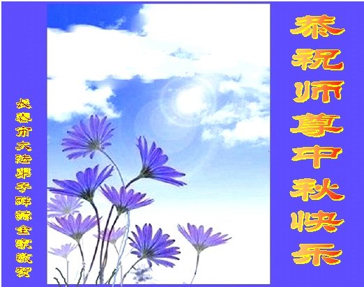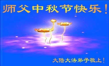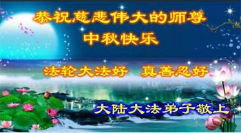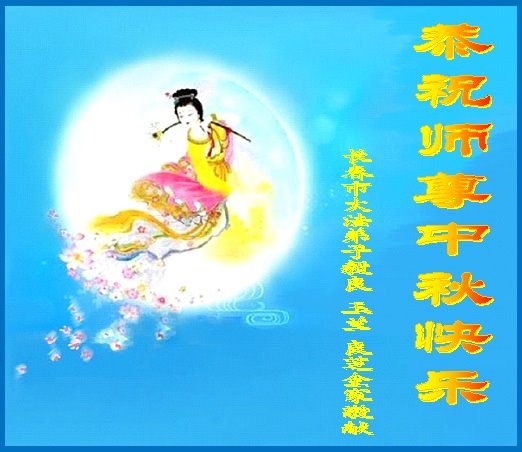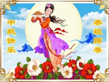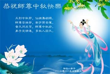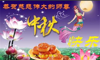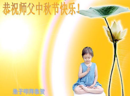 中秋佳节到来了,弟子恭贺师父佳节快乐!中秋是圆满的日子,弟子深深知道师父给予我们的法轮大法,能使我们修炼圆满。一些同修在大法中修炼勇猛精進,修成了,成为真正的大法徒,他们无愧师父的慈悲救度, 无愧于他们世界众生的期盼,他们的生命已经走向永恒。弟子惭愧,在目前师父的巨大承受下延长的修炼时间里,还不知道很珍惜,至今还有很多执着没有放下,没有修去,弟子希望能在今后的修炼中严格按法轮大法的要求去修炼,走向圆满。弟子无限感激师父的洪大慈悲救度之恩,在中秋佳节叩谢师父!,弟子给师父深深的敬合十礼!