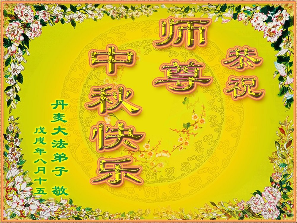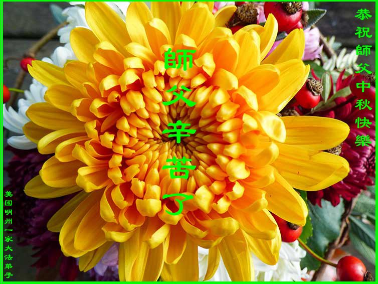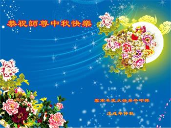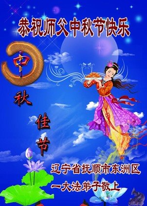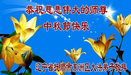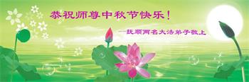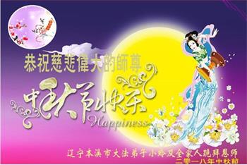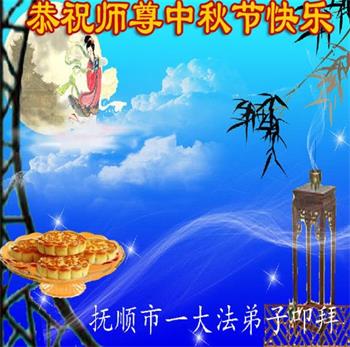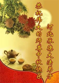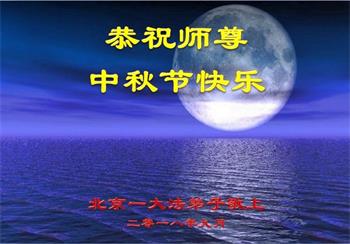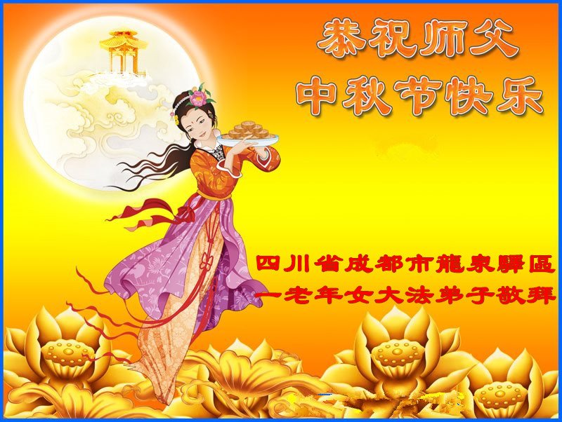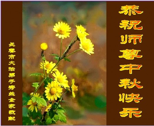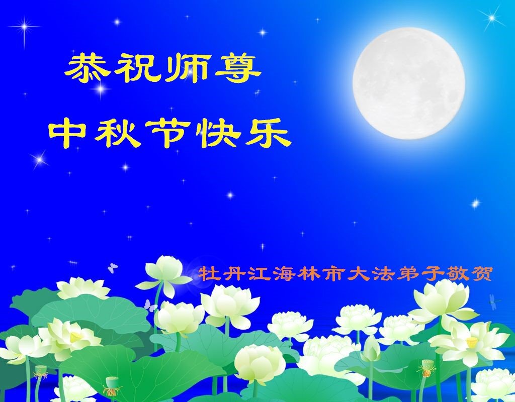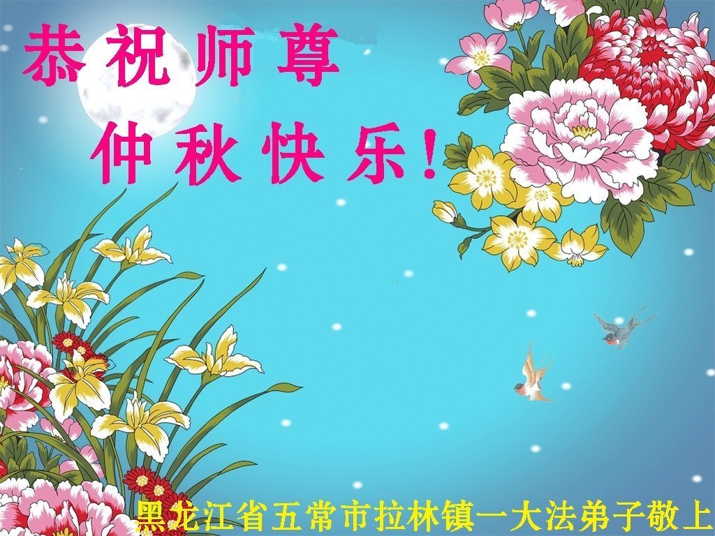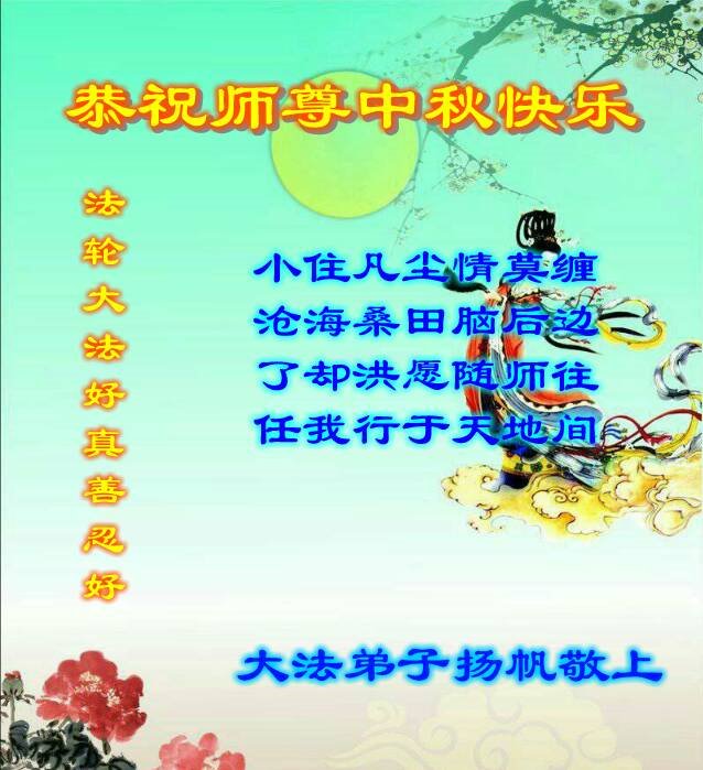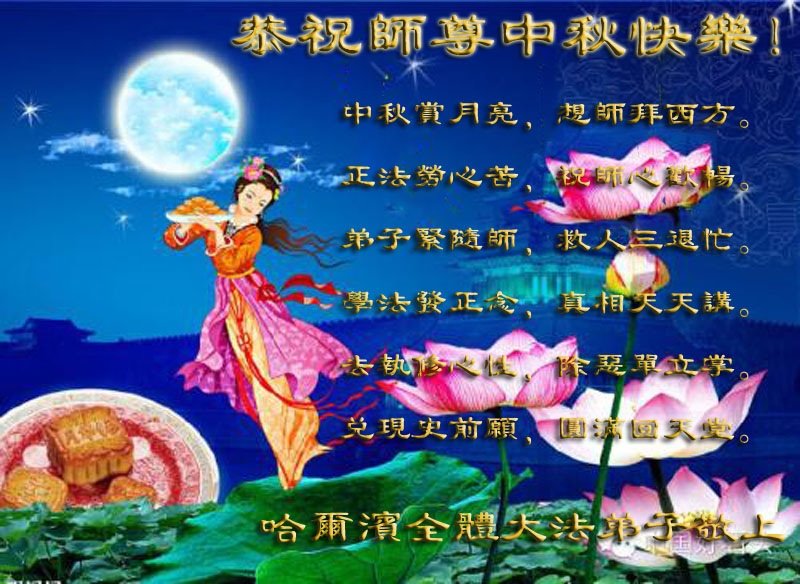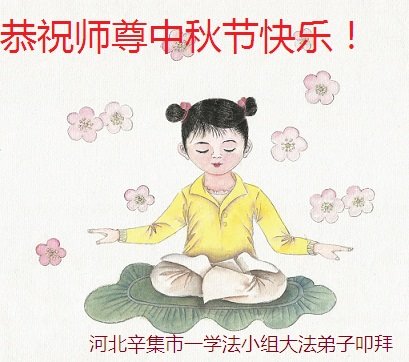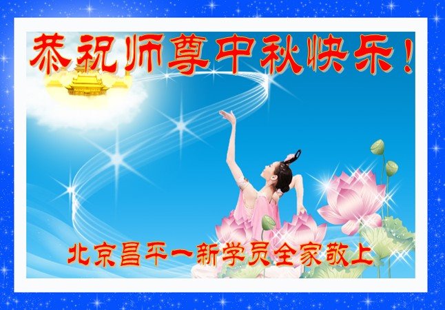 中秋佳节到来了,弟子恭贺师父佳节快乐!中秋是圆满的日子,弟子深深知道师父给予我们的法轮大法,能使我们修炼圆满。一些同修在大法中修炼勇猛精進,修成了,成为真正的大法徒,他们无愧师父的慈悲救度, 无愧于他们世界众生的期盼,他们的生命已经走向永恒。弟子惭愧,在目前师父的巨大承受下延长的修炼时间里,还不知道很珍惜,至今还有很多执着没有放下,没有修去,弟子希望能在今后的修炼中严格按法轮大法的要求去修炼,走向圆满。弟子无限感激师父的洪大慈悲救度之恩,在中秋佳节叩谢师父!,弟子给师父深深的敬合十礼!