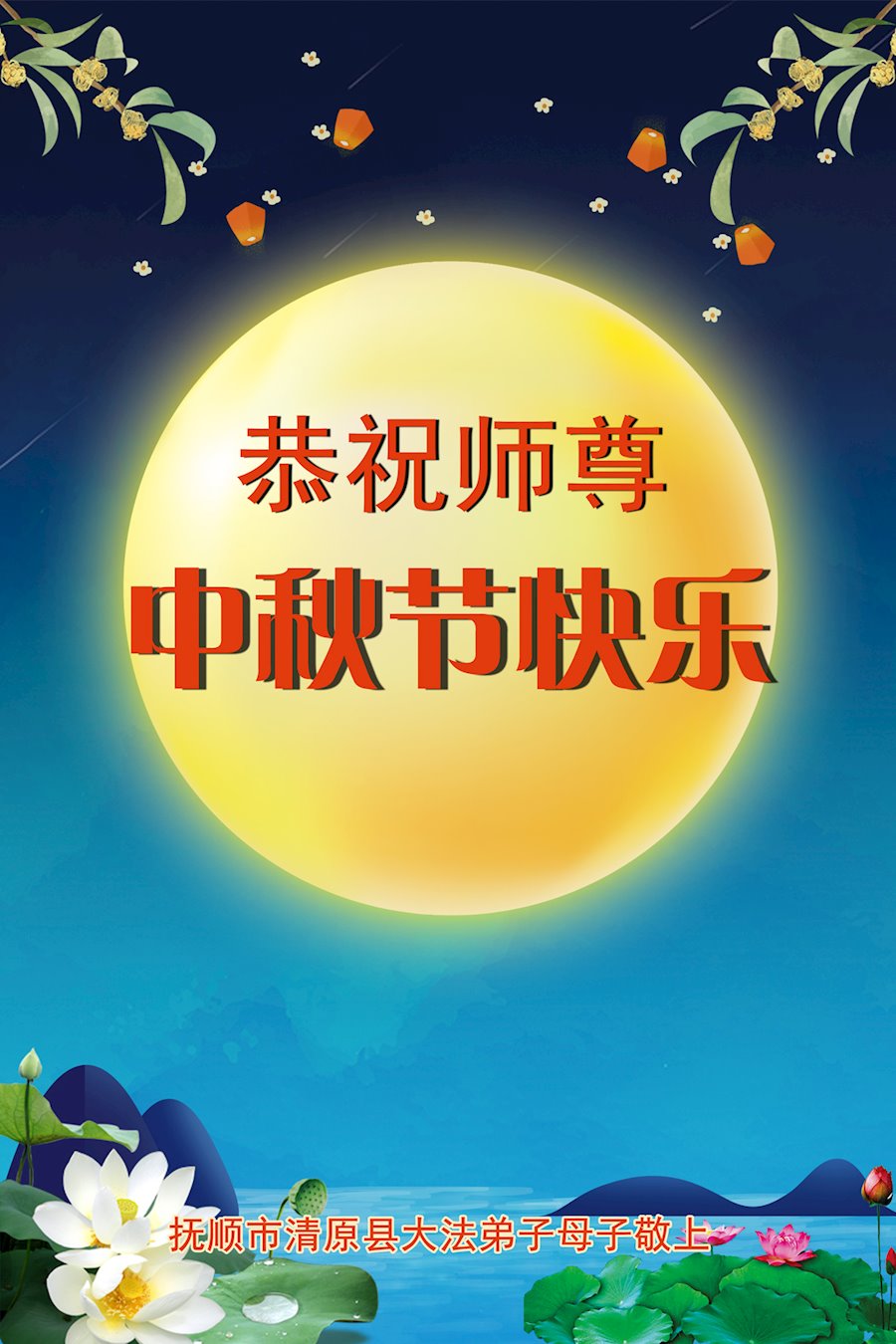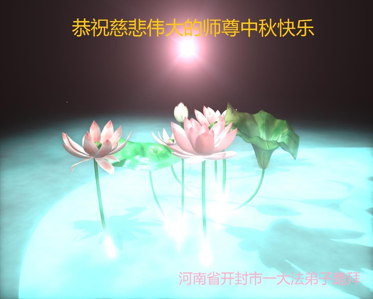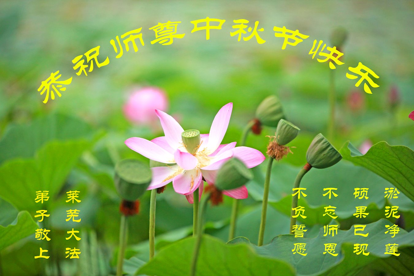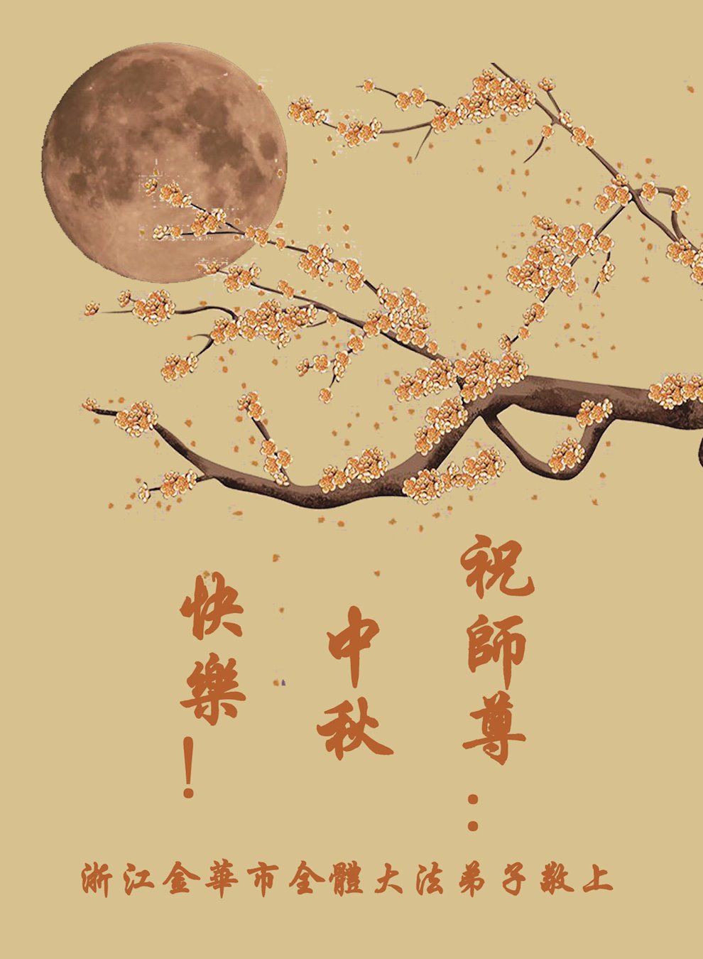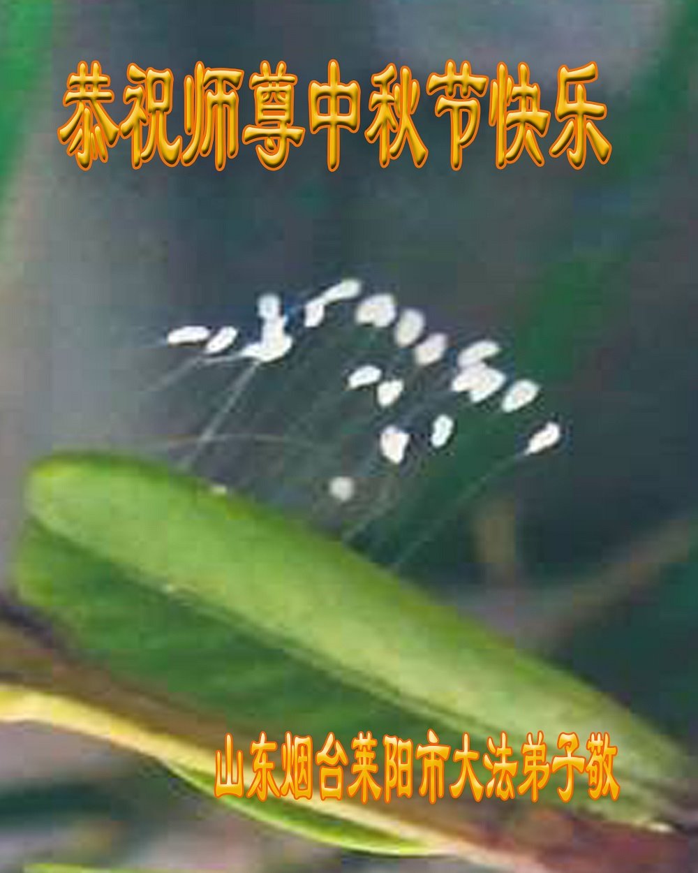 师尊您好!师尊辛苦了!在这中秋佳节来临之际,弟子非常想念师尊,弟子心怀无限的感恩和崇敬恭祝师尊中秋快乐!在弟子修炼路上每前進一步,都浸透了师尊的无量慈悲和巨大付出,弟子叩谢师尊佛恩浩荡! 我们要学好法、学懂法,修好自己,在提高心性上多下功夫,认真做好三件事,这是我们的责任,我们一定会做得更好,因为我们有伟大的师父,有伟大的法!