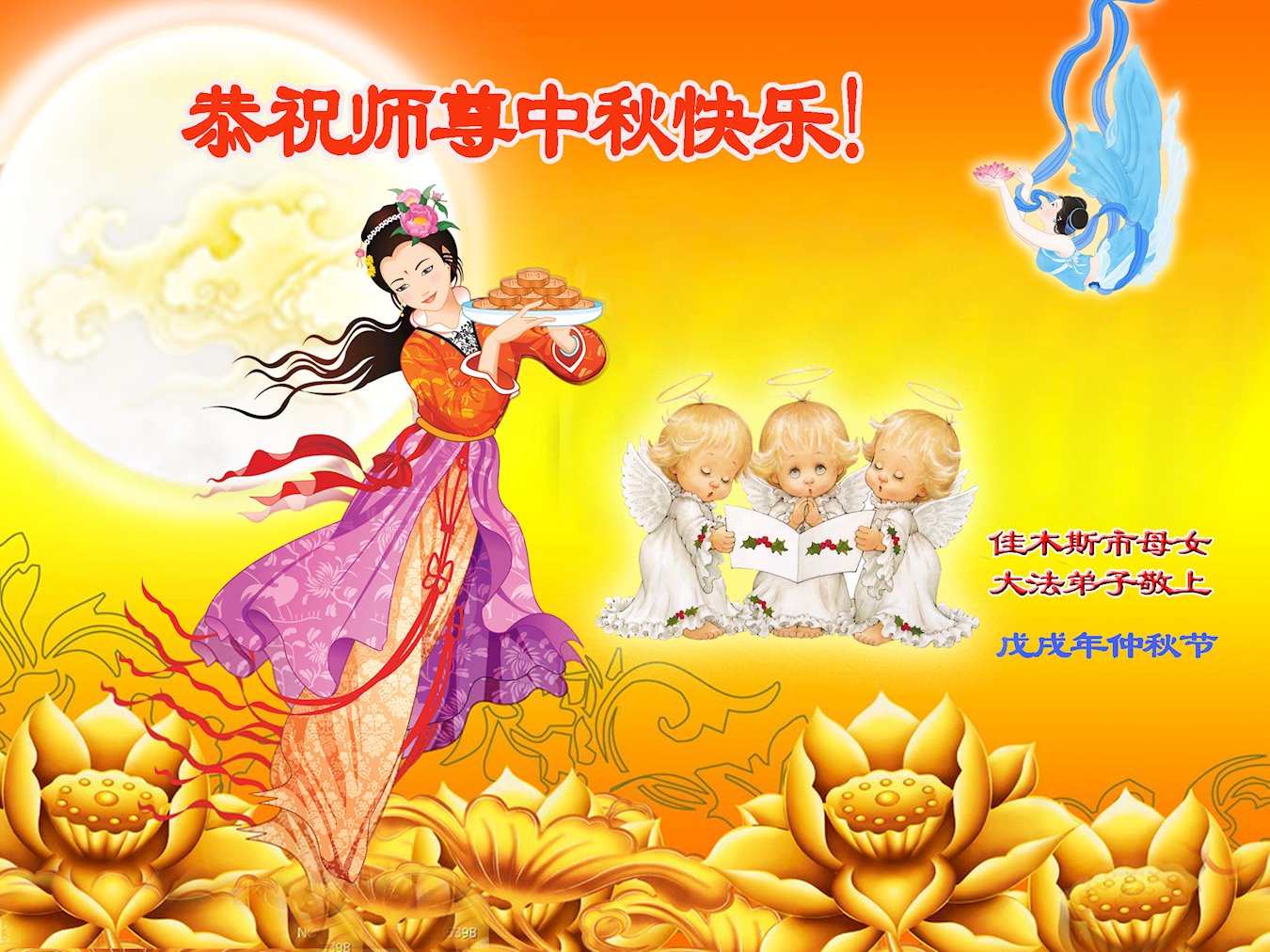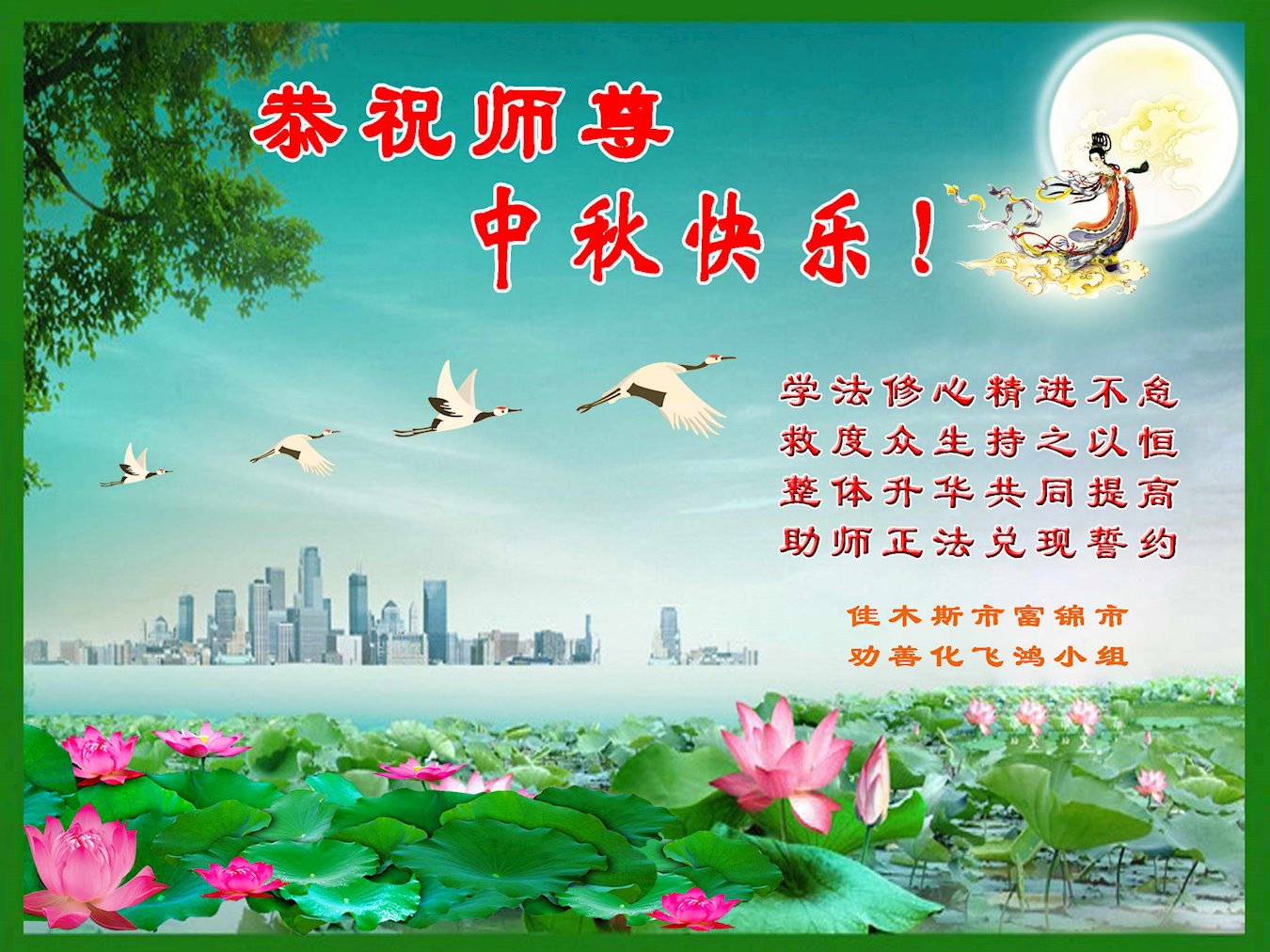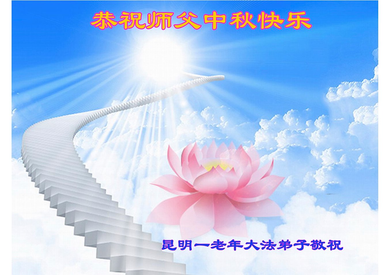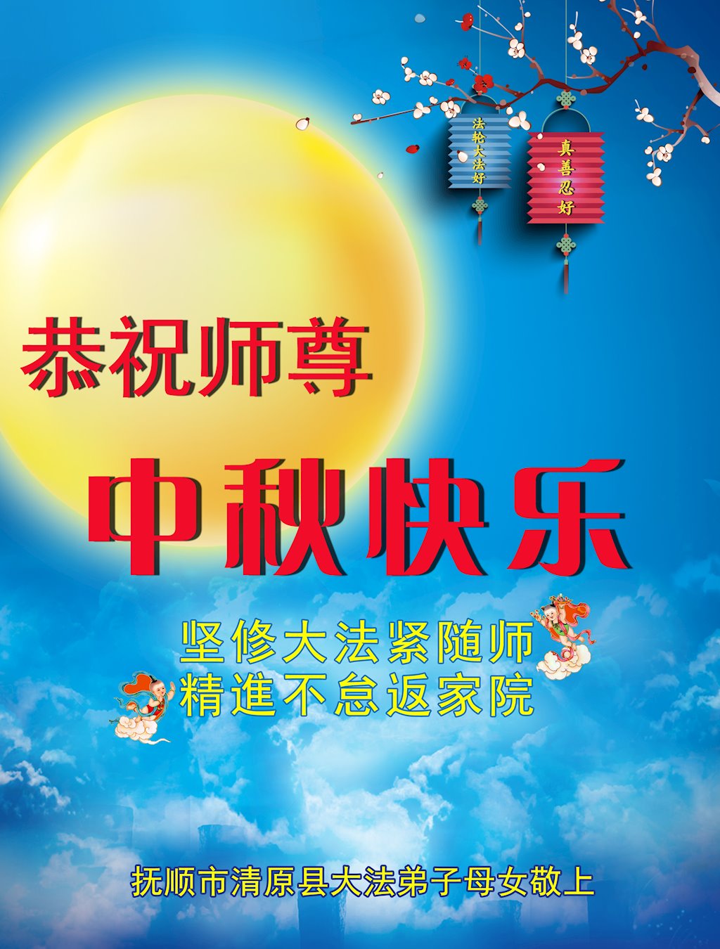 师尊您好!师尊辛苦了!在这中秋佳节来临之际,弟子非常想念师尊,弟子心怀无限的感恩和崇敬恭祝师尊中秋快乐!在弟子修炼路上每前進一步,都浸透了师尊的无量慈悲和巨大付出,弟子叩谢师尊佛恩浩荡! 我们要学好法、学懂法,修好自己,在提高心性上多下功夫,认真做好三件事,这是我们的责任,我们一定会做得更好,因为我们有伟大的师父,有伟大的法!