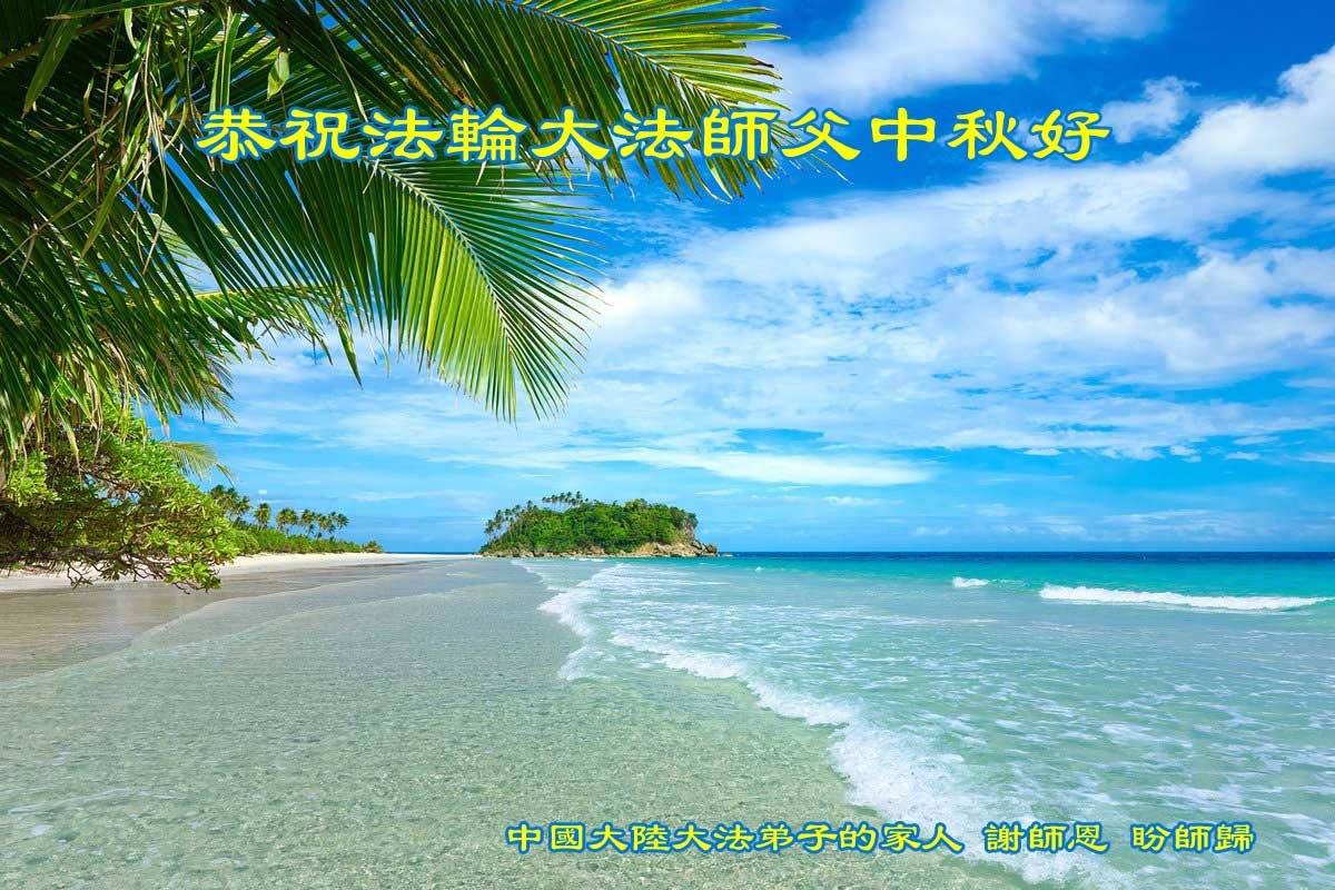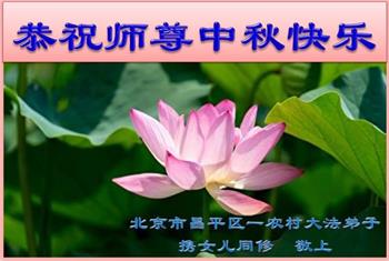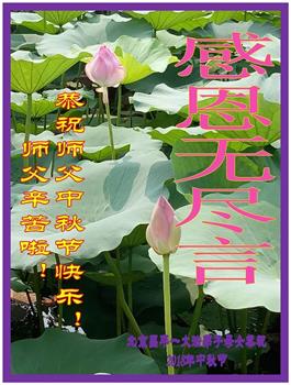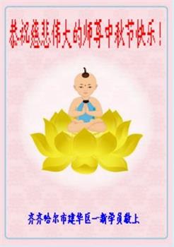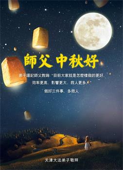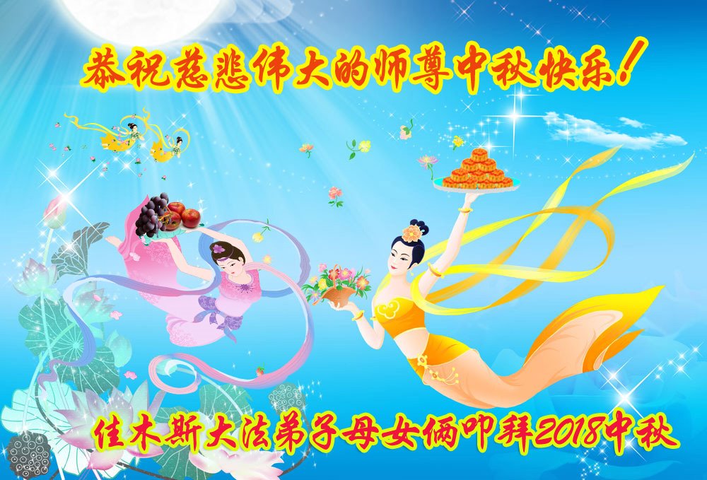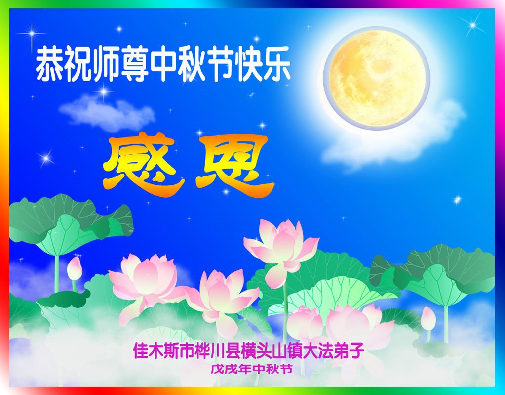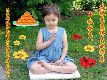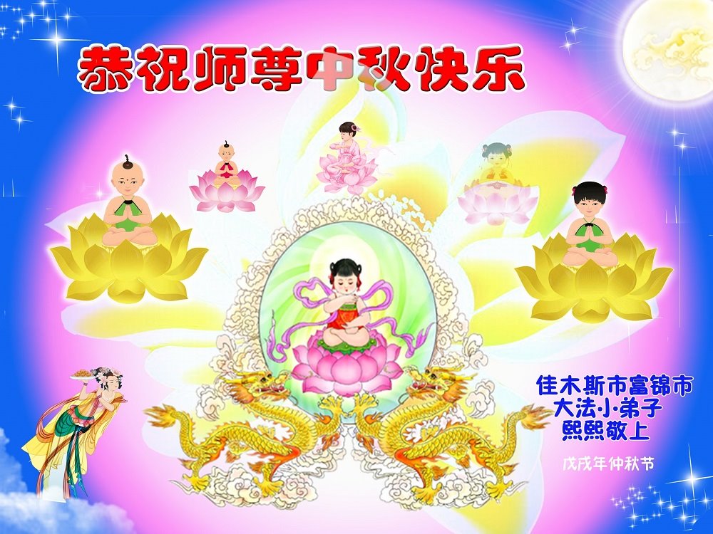 师父洪大的慈悲、为众生艰辛的付出,倾尽人类所有的语言都无法表达。值此中秋佳节之际,我和我的女儿——昔日的小同修恭祝慈悲伟大的师尊中秋快乐!并叩谢师恩!我女儿于一九九七年不到十岁时就随我到炼功点炼功,参加过四、二五。一九九九年七.二零法轮功被迫害的前一天,我们参加了最后一次集体炼功。那天,我对女儿说,咱们一起回到天上去好吗?女儿说好。就这一字的应诺,师父就一直在管着她。法轮功被迫害后,我怕未成年的孩子应付不了残酷的迫害,就没带她继续修炼。但师父始终没有放弃她。前几年,师父安排她来到海外修炼,然而由于某些原因,她没能走入修炼。最近师父再次为她做了安排,她终于走進了修炼。慈悲伟大的师父不想落下每一个昔日同修和当年的小弟子,希望还没有走回修炼的同修,不枉师父的慈悲苦度,赶快回到大法中来吧。再次叩谢师恩!合十