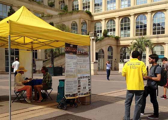 九月十五日,法国法轮功学员在蒙彼利埃市的保尔贝克广场向民众介绍法轮功,展示功法,并揭露中共残酷迫害法轮功学员的罪行。