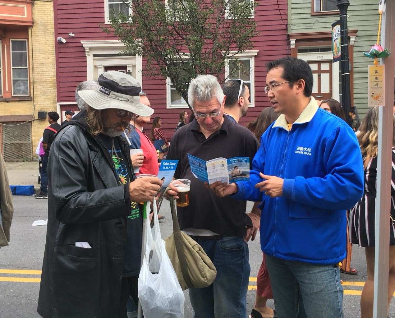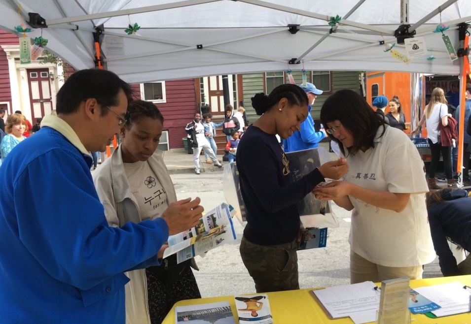 当天风和日丽,从早晨10点半到下午6点,云雀街人流熙熙攘攘,人们或举家出行,或呼朋引伴,或独享欢快的气氛,许多人在法轮功展位前停留。有的拿到介绍法轮功的传单,认真阅读;有的与法轮功学员交谈,了解到修炼给人身心带来的升华,以及近20年来中共对法轮功的残酷迫害。了解了真相的人们有的当场学炼法轮功,有的签名谴责中共迫害,有时要签名的人很多,大家排队耐心等待签名,表达自己的正义呼声。