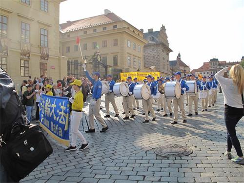 在法轮功游行队伍在布拉格古城穿过时,有很多中国人驻足观看拍照录像,有人立即用手机把信息分享出去,有的在说,“哇,(法轮功)队伍这么长。”