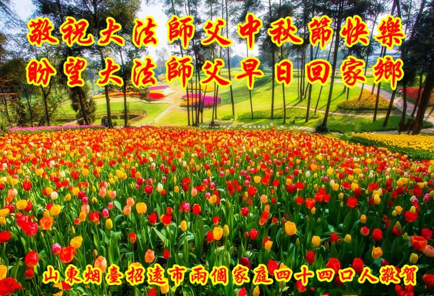 山东烟台招远市两个家庭四十四口人恭祝大法师父中秋节快乐!他们在贺词中说:中共打压法轮大法近二十年,我们亲眼见证了大法的超常和了不起,见证了中国大陆大法弟子的和平理性、坚忍不拔的高贵品质,邪不压正!中共邪党整人、害人,假、恶、斗的邪恶本质和犯下的滔天大罪早已失去人心。法轮大法是正法,不仅祛病健身有奇效,大法能归正人心,从根本上改变人。尽管现在邪党还没有停止对法轮大法的迫害,那也不过是灭亡前的垂死挣扎,是回光返照!法轮大法在中国和世界洪传,将对人类道德的升华,传统的回归起到巨大的推进作用。从大法弟子的身上我们看到了中国未来的希望。