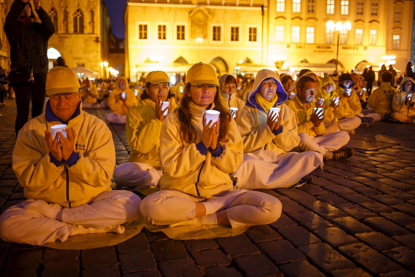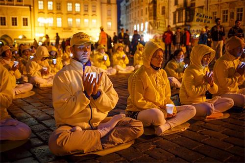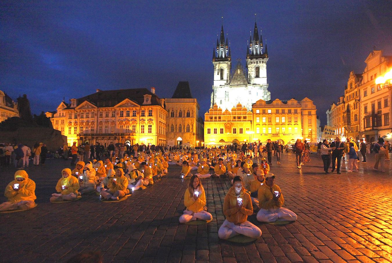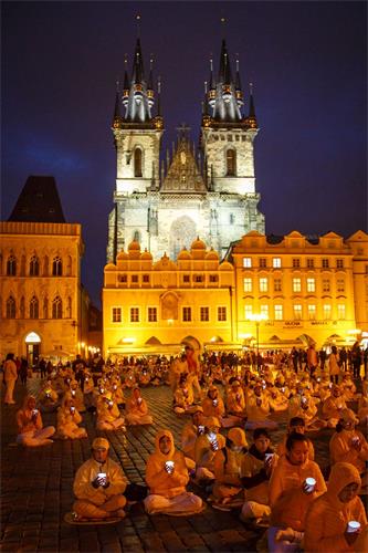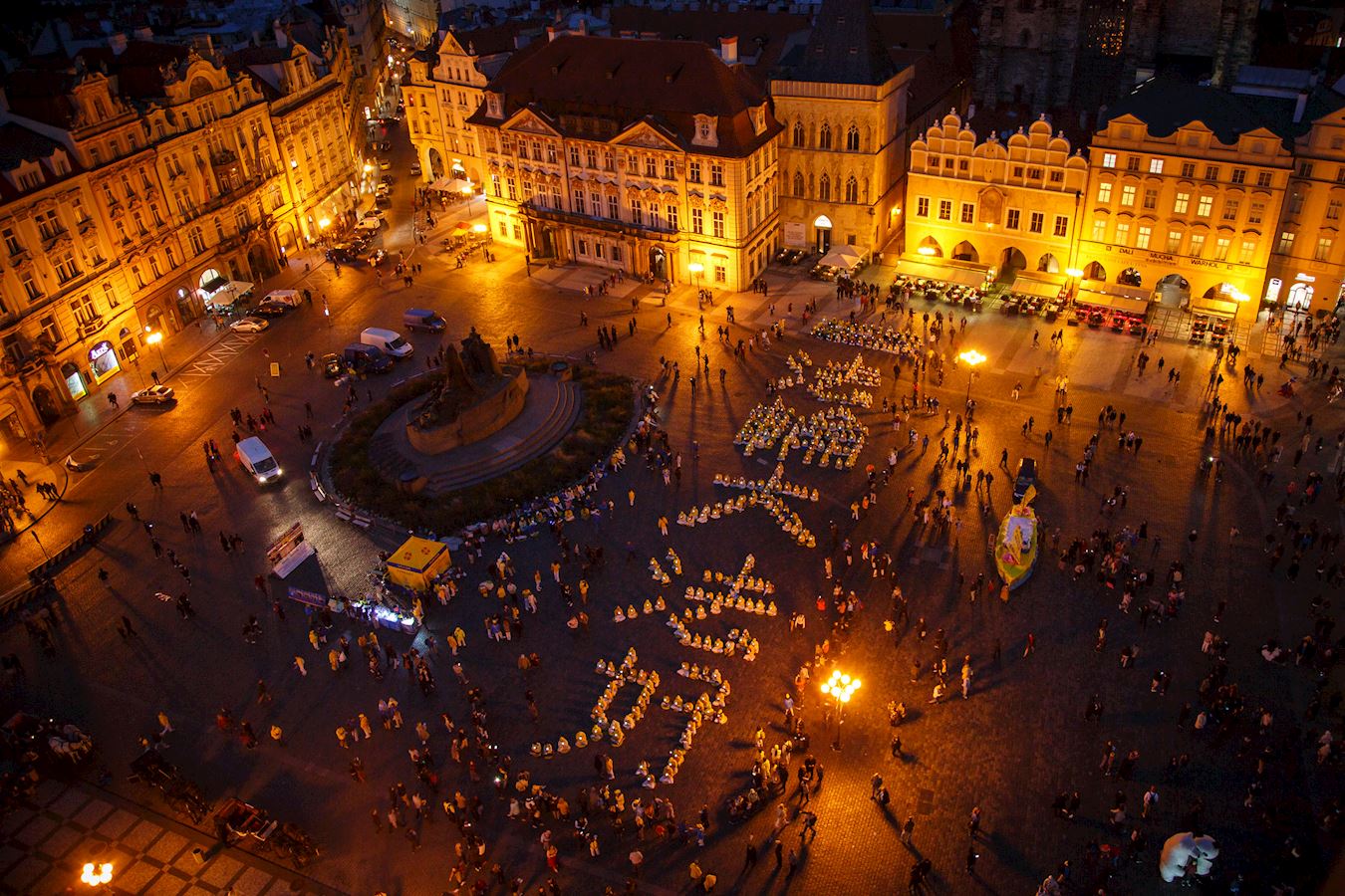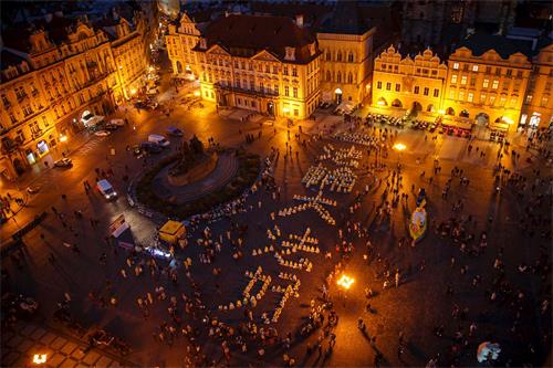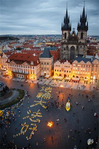 二零一八年九月二十八日晚,来自欧洲三十七国的部份法轮功学员参加了组字活动。时逢捷克人民纪念其守护者瓦茨拉夫的节日,也是捷克国家意识纪念日,老城内人山人海,摩肩接踵,游客如织,加上节假日,布拉格老城广场上的人群更是川流不息。
