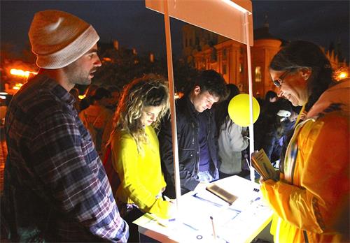 很多观看法轮功学员组字的民众表示非常好看和壮观,有的说自己感受到了强大的能量,也有不少民众到信息台了解法轮功真相和索要资料。当他们得知这是法轮功学员的反迫害活动时,纷纷签名声援法轮功学员。