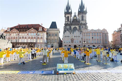 图1~3:二零一八年九月二十八日上午,来自欧洲各国的一千五百多名法轮功学员聚集在布拉格的老城区广场,进行了集体炼功、讲真相和征集签名反迫害活动