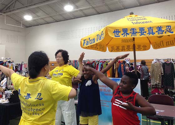 九月一日,法轮功学员们来到美国马里兰州盖城的社区集市介绍功法,来学功的人络绎不绝,直到活动结束时间,还有人接着学功。