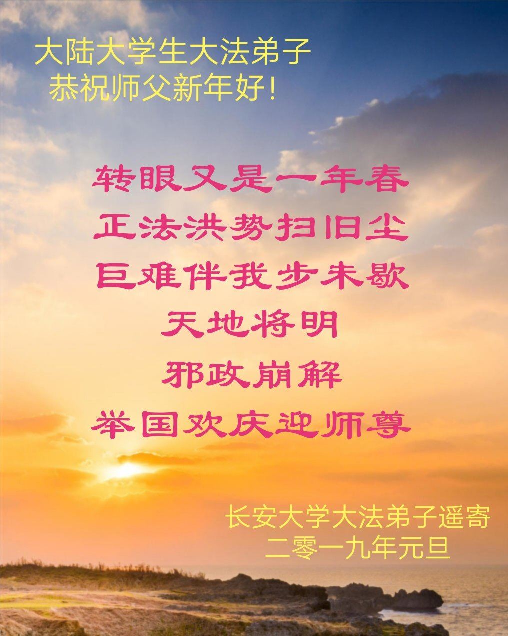法轮大法自一九九二年传出,七年之内,修者上亿,祛病健身,道德回升。江泽民以小人之妒嫉,迫害法轮功,以谎言污蔑大法,欺骗世人。为了还原真相,自迫害之日起,大法弟子们不顾个人安危,以各种方式给世人讲大法真相,这与每个人的安危和未来切身相关。大法弟子讲真相迄今二十个年头,还在一如既往坚持。在中共的邪恶迫害中,中国大陆大法弟子们历经魔炼,在修炼中不断精進和成熟,表示新一年更精進,多救人。