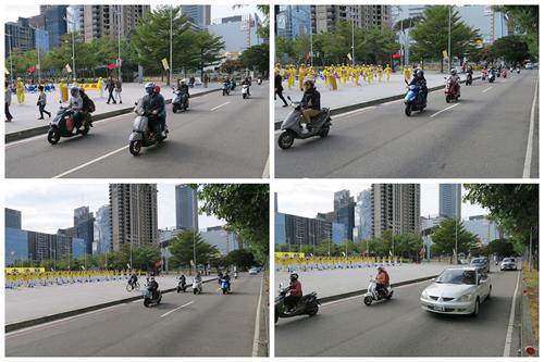 ![]() 图5~6:台中市政府广场前的台湾大道,车辆行人不断,过往民众纷纷拿出手机拍照,有的跟着比划动作,学炼法轮功。 |