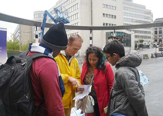 九月二十八日星期六,法轮功学员在比利时布鲁塞尔市中心举办反迫害活动,很多民众驻足,希望了解迫害真相,并支持法轮功学员反迫害。