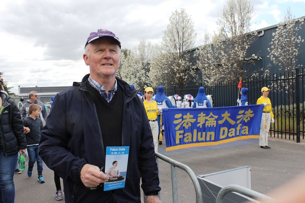 他说:“由于工作原因,我每天要开几个小时的车。所以经常会觉得后背不舒服。以前我去健身房锻练,感觉会稍微缓解点,但第二天上班还是不舒服。这种状态持续了很久也就成习惯了。修炼以后,也就把背不舒服的事情忘了。每天还是一样的工作,但也没觉得哪里不舒服,才意识到是修炼后身体康复了。我平时会读《转法轮》给两个小女儿听,给她们讲一些做人的道理。孩子们学会了为他人着想。“ “我参加天国乐团,我很想让更多的人了解法轮大法的美好,我觉得天国乐团的音乐是那么震撼人心。这是我第一次穿上古装游行,感觉很威武,游行时也觉得自己像个战士。周一去上班,我和我的经理聊了一会周末的活动,他告诉我他们全家去了墨尔本秀,观看了游行,他的太太很喜欢天国乐团的表演,还录了视频。当经理得知我也在游行队伍中打大鼓,他非常惊喜,我借此给他讲了法轮功的真相,以及自己全家修炼受益的体会。”