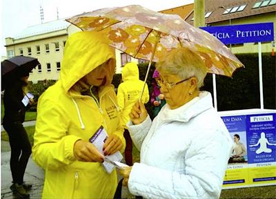 斯洛伐克赫洛霍韦茨市法轮功学员们摆开信息台,跟民众讲述法轮功真相。很多人了解后,立即签名支持法轮功学员坚持正信反迫害。