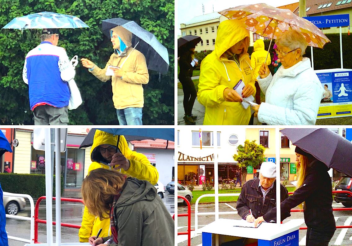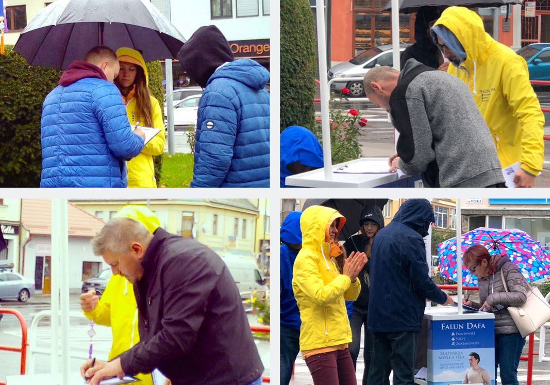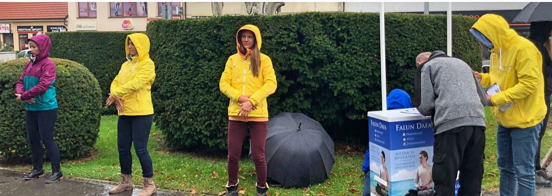 【明慧网二零一九年十月十一日】二零一九年十月五日上午,斯洛伐克赫洛霍韦茨(Hlohovec)市虽然阴雨蒙蒙,当地法轮功学员们依然来到城市市中心摆开信息台,有的随着悦耳的炼功音乐演示功法,有的学员站在要道口派发真相传单,并跟民众讲述什么是法轮大法以及中共对法轮功学员的迫害真相。很多民众了解到真相后,立即签名表示支持法轮功学员坚持正信反迫害。