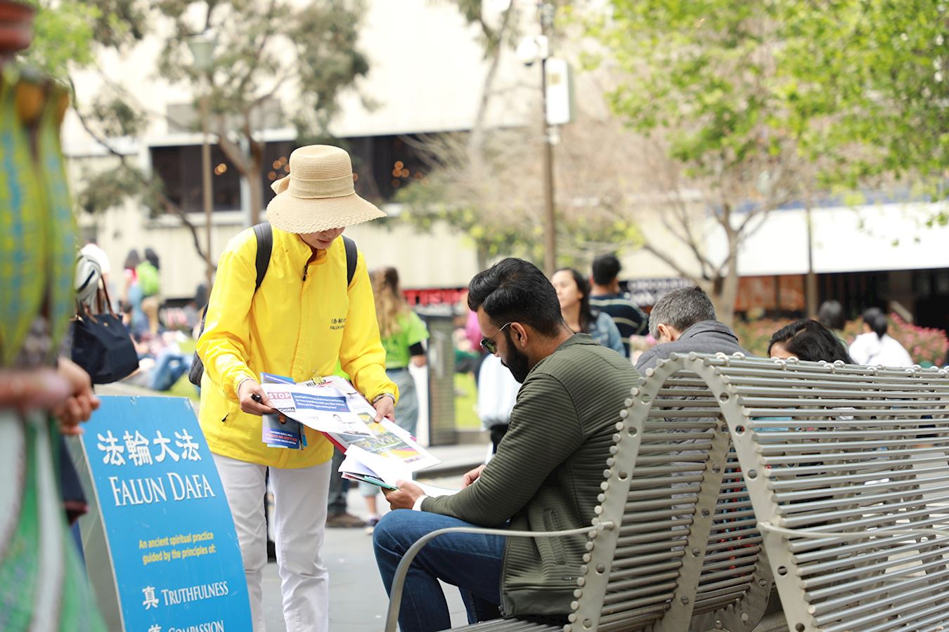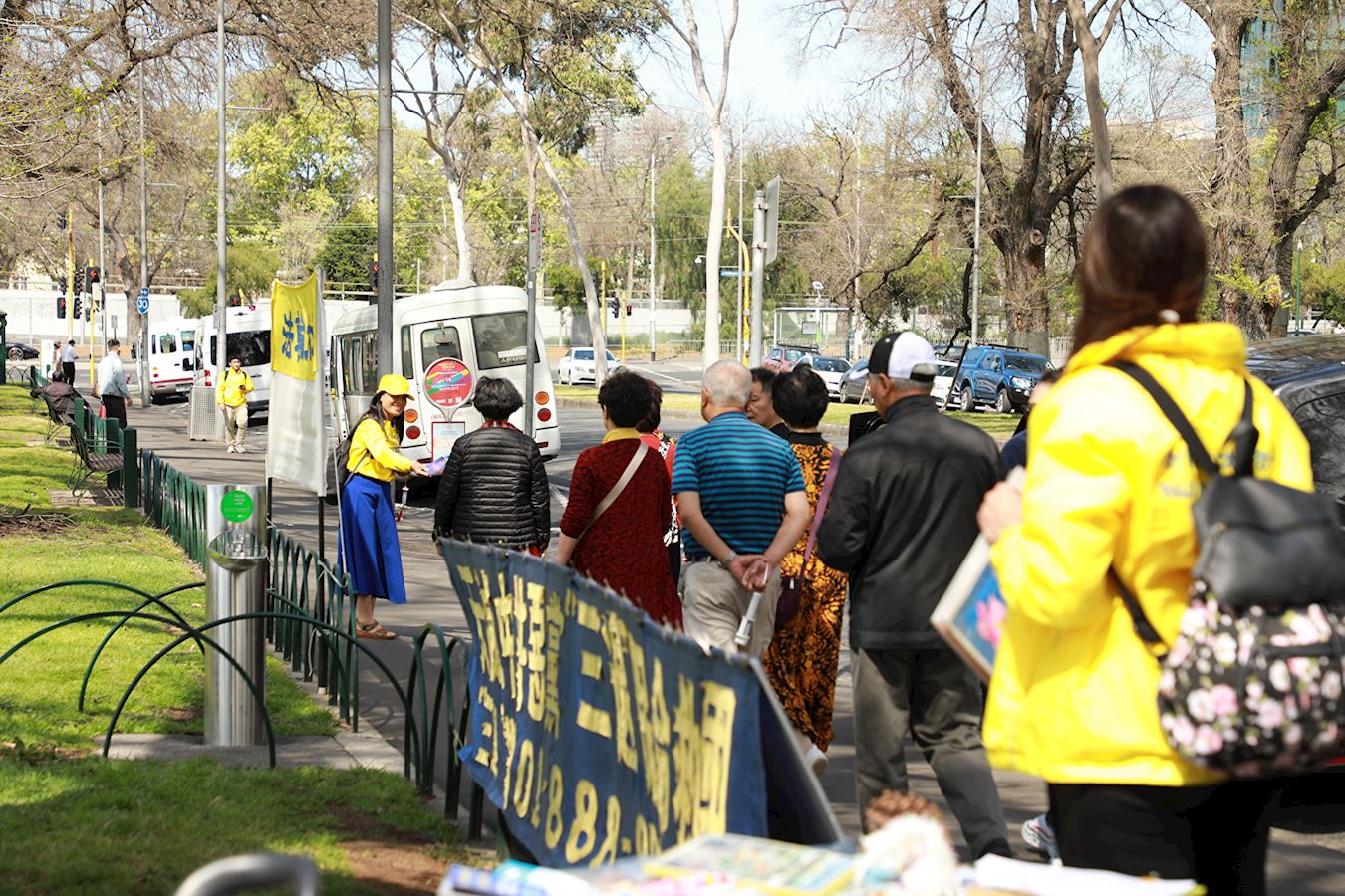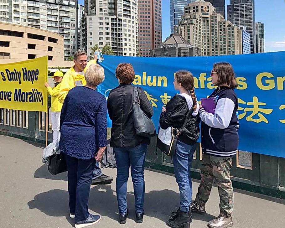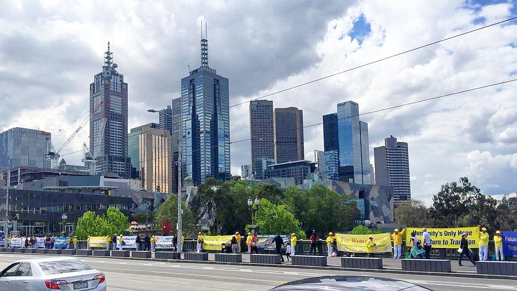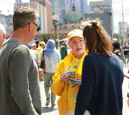 这是澳洲年度法会期间系列活动的一部份。连日来,身着黄衣的中西方法轮功学员为这座文化名城热闹的市中心增添了清新、亮丽的风景线,让春天的墨尔本充满温暖、祥和的氛围。周六当天,学员们向来自世界各地的游客和墨尔本市民讲述真相,呼吁共同努力制止中共对无辜善良人的迫害。