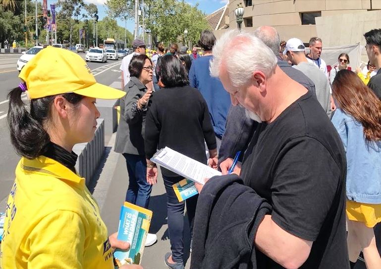 墨尔本居民亨利(Henry)和妻子都在反迫害征签表上签了名。他说,他们曾经去过北京,也了解中共政权对人权的迫害,“我曾经在波兰生活,我知道共产党的本性,它残暴对待人民,一味地做它要做的。我读过很多关于中共活摘器官的文章,我希望能够停止迫害。‘真善忍’对人类是很重要的。”他表示会告诉更多人真相,也希望中国的法轮功学员获得信仰的自由。