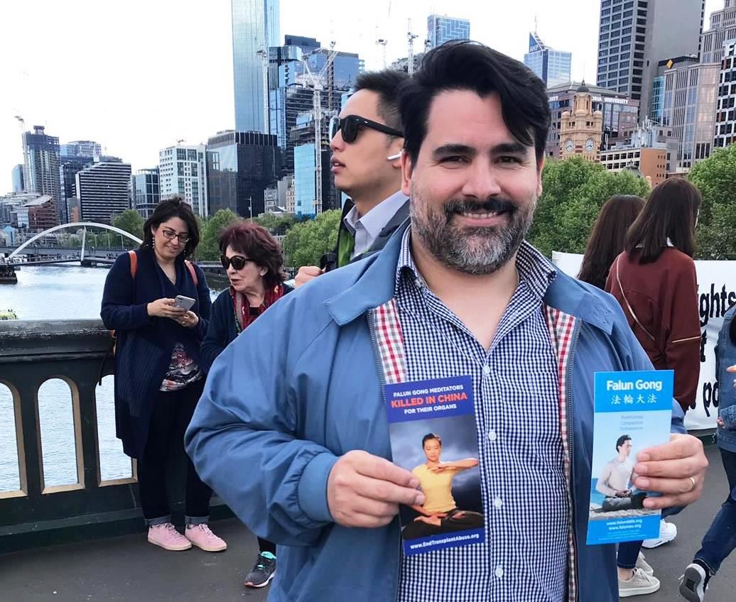 马西欧(Marcio)在和法轮功学员的交谈中了解真相后说:“我在澳大利亚已经住了十年了。我非常关注此事,我对中共极其厌恶。我第一次听到活摘器官,这比纳粹还要邪恶。我们澳大利亚政府需要为此做点什么。我会把此事告诉我所有的家人、朋友和同事。每个人都信仰权利,不要被这邪恶政权吓倒。”他还说:“我们需要‘真善忍’,这样我们才能和睦相处,包容多种文化,这个国家才会美好。”