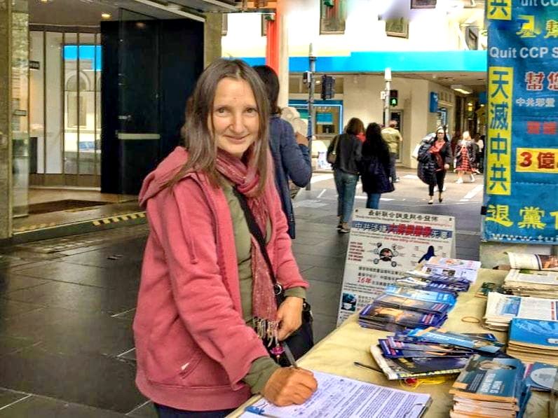 墨尔本居民朱莉(Julie)女士当天特意来唐人街真相点签署反迫害请愿书,她说:“昨天路过费茨罗伊公园的时候遇见法轮功学员在那里炼功,才第一次听说法轮功。一位法轮功女士告诉了我中共活摘法轮功学员器官的罪恶,但我昨天没时间签请愿书,今天我特地来签署请愿书,呼吁中共停止活摘法轮功学员器官。希望中国法轮功学员一切安好,恢复炼法轮功的自由。”