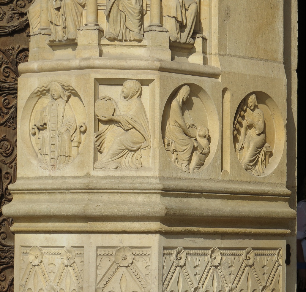 图例:巴黎圣母院(Cathédrale Notre-Dame de Paris)右侧门像柱浮雕装饰,从左到右表现的主题依次是哲学、天文学、语法学和音乐。