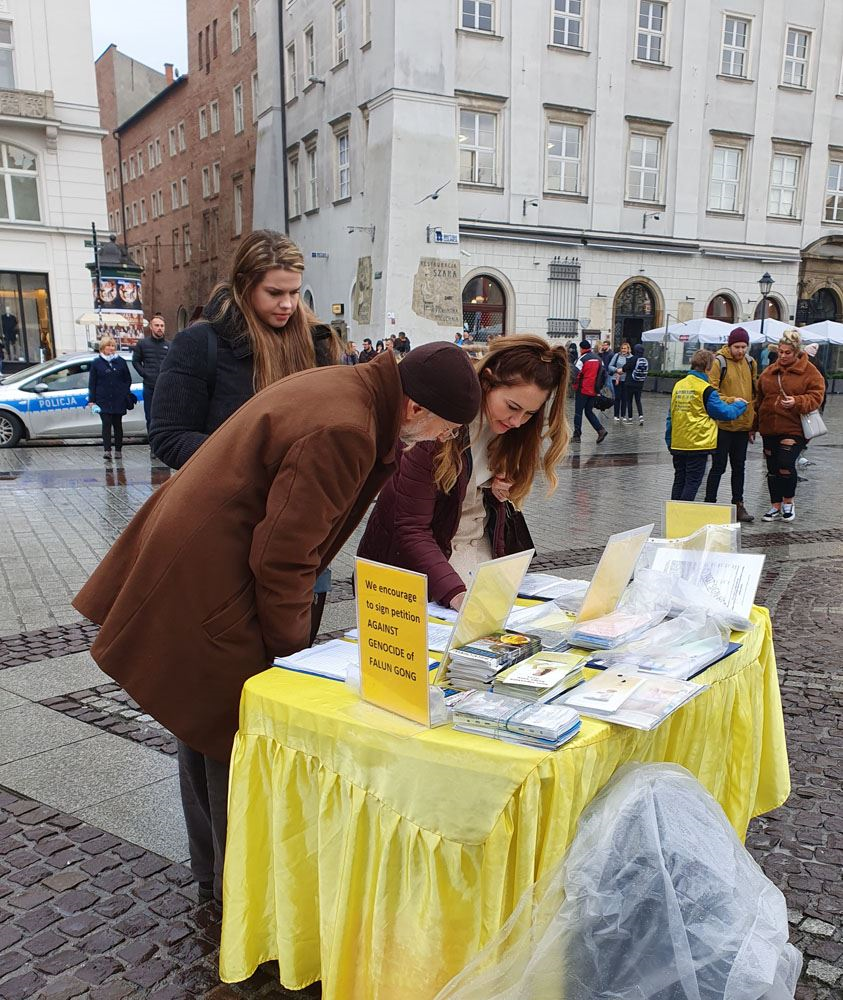 【明慧网二零一九年十一月十八日】二零一九年十一月九日至十日,波兰法轮功学员在欧洲著名旅游城市克拉科夫(Kraków)古城中央市集广场及瓦维尔皇家城堡(Wawel Castle)旁举办活动,介绍法轮功,揭露中共多年来对法轮功群体灭绝式的残酷迫害及活摘器官罪行。多国游客震惊于这些事实真相,纷纷在雨中签署《举报江泽民迫害法轮功之罪行的刑事举报书》及给波兰总理及参众两院议长的《请愿书》,支持法轮功反迫害,抗议中共的邪恶与残暴。
