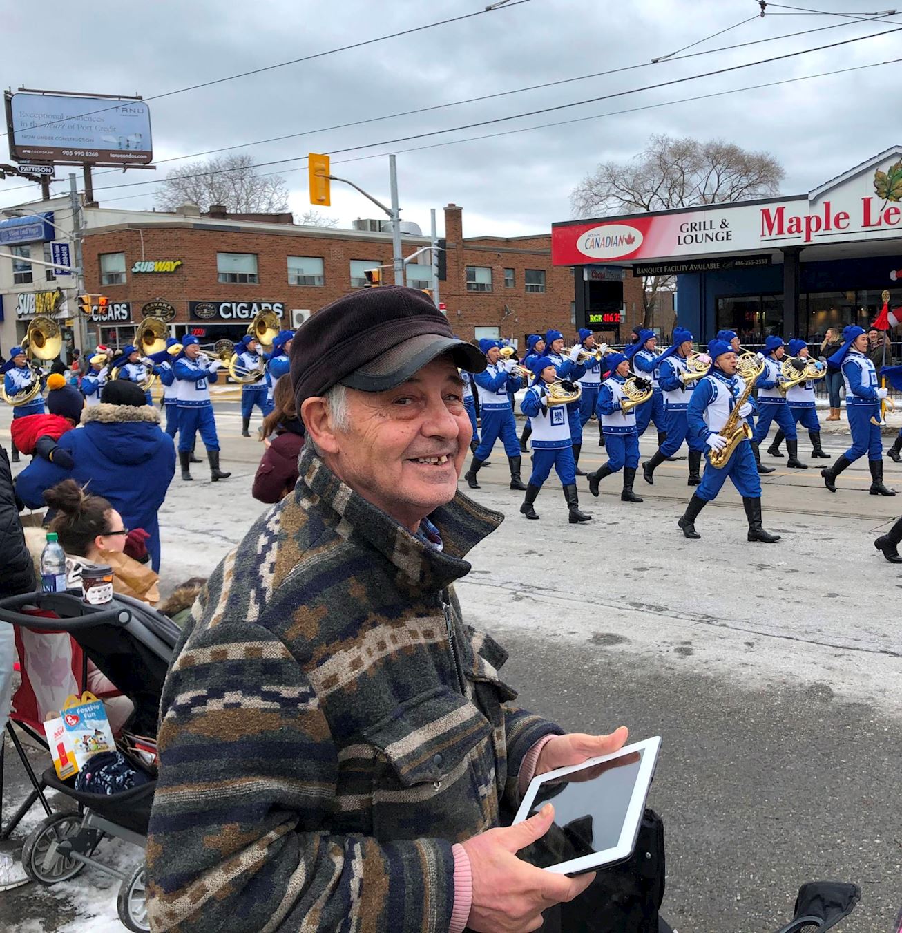 和家人一起观看游行的马可(Marco)先生,在天国乐团经过时和家人大声欢呼:“我爱你们,非常棒的演奏!”