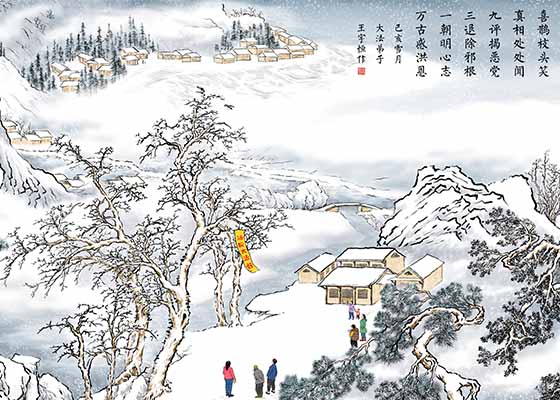 法轮大法好 法徒传乡亲 十里踏雪夜 百户送福音