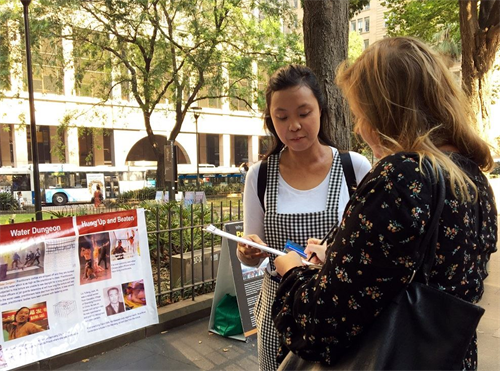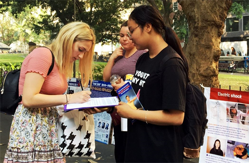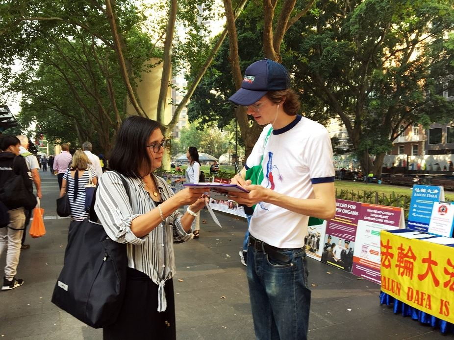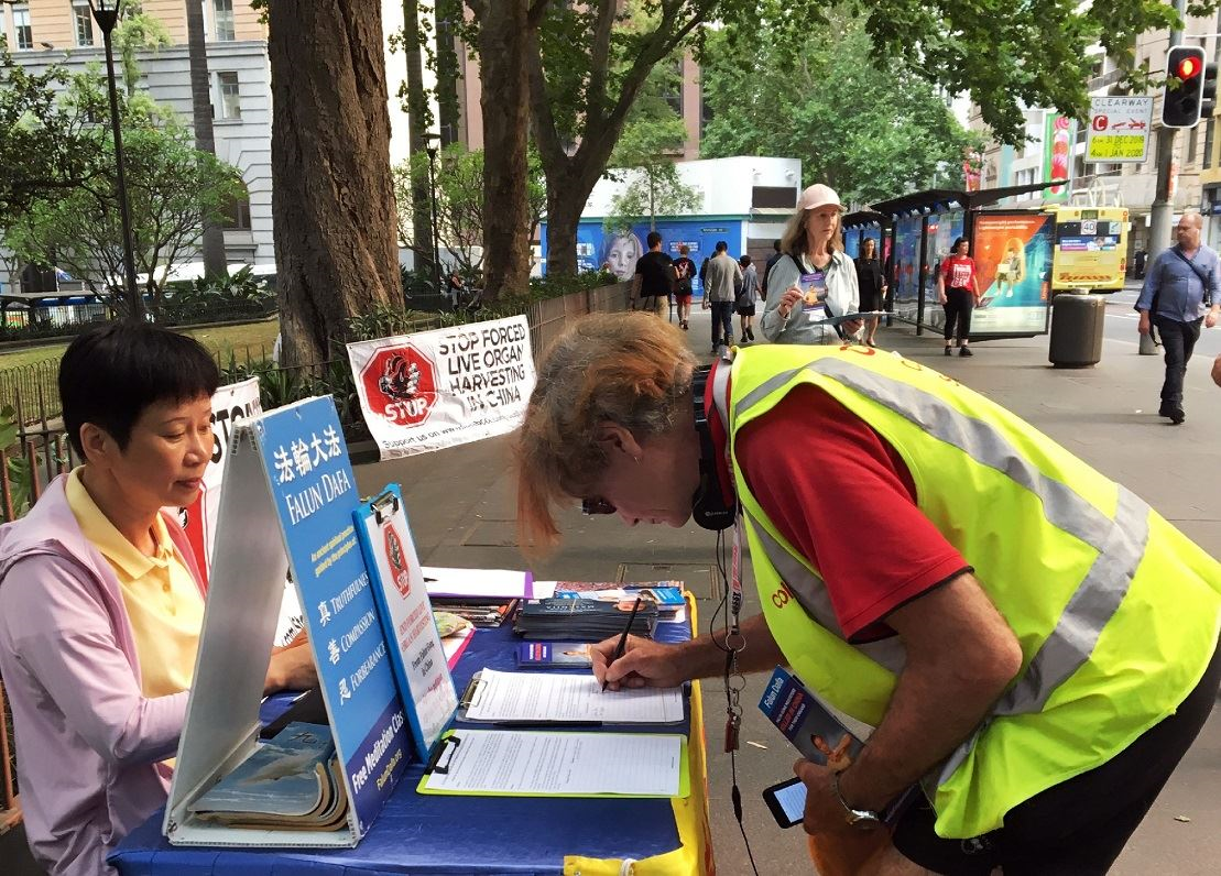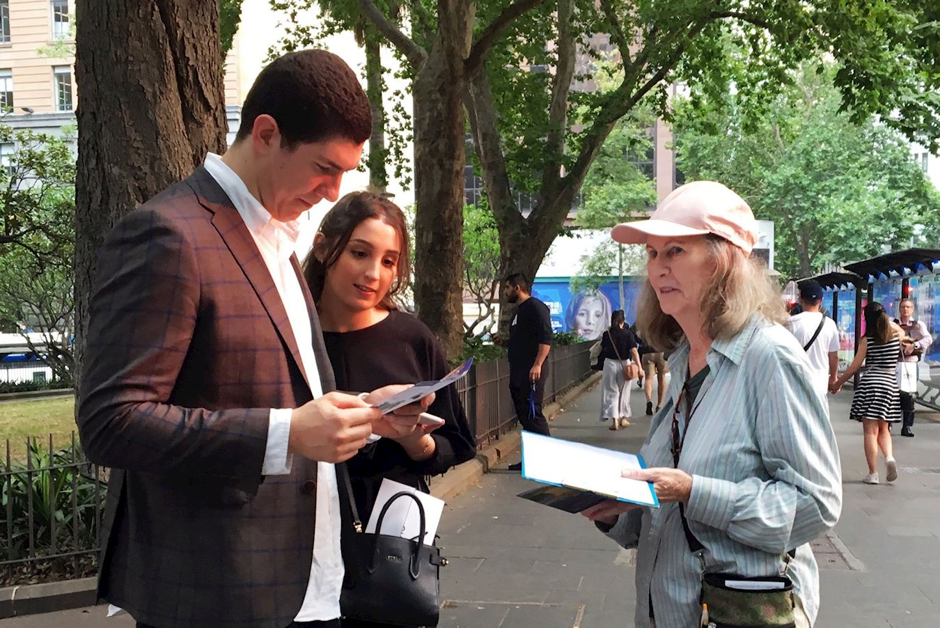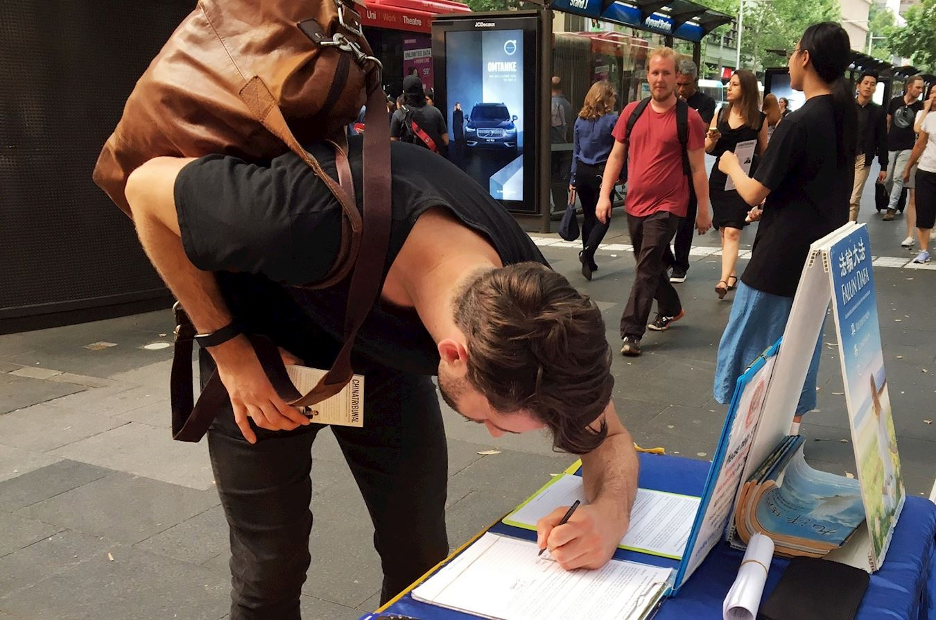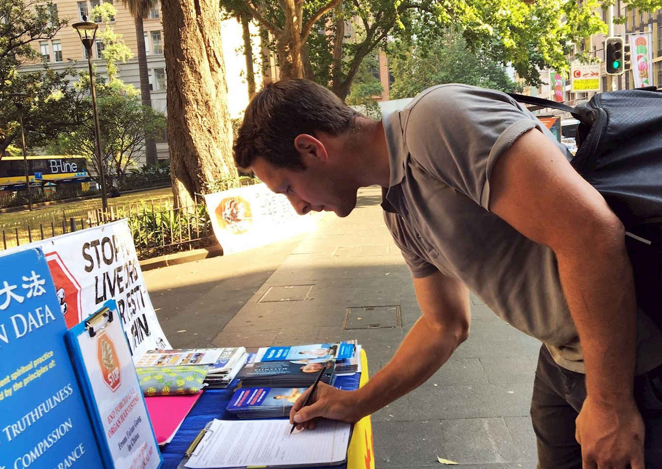 曾在澳大利亚银行业供职的澳洲人拉克兰·布朗(Lachlan Brown)先生下班途径法轮功展位时主动过来在给澳大利亚政府的请愿书上签名。他说:“如果我没有理解错的话,法轮功因为信仰而遭受迫害。我认为,澳洲有很多华裔澳大利亚人居住在这里,这对澳洲政府来说对法轮功的支持和立场真的很重要,说我们不赞成(中共迫害法轮功)这样的做法,不会损害声誉,需要(跟中共)对话,我们才能帮到(法轮功)。”