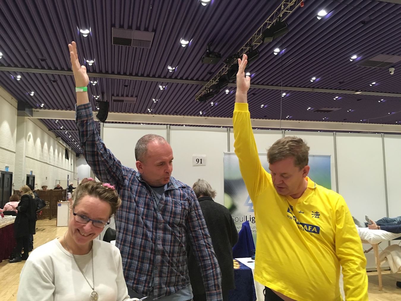 弗莱明·安德森(Flemming Andersen)练过瑜伽,当他看到学员展示优美的法轮功五套功法缓慢圆的动作,感觉非常好,随即跟着学炼起来。从第一套学到第四套。在学炼第二套法轮桩法,就希望能多保持一会儿姿势。他表示感觉一种很舒服,祥和的能量。他的女朋友也加入进来学了第三和第四套。临走时,他留下联系方式,表示参加以后举办的教功班。