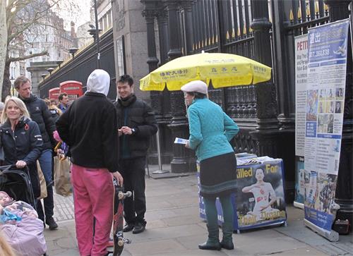 当天下午,一位在中国大陆工作的台湾女子在大英博物馆前与一位法轮功学员交谈后改变了对法轮功的看法,随后她签名支持法轮功学员反迫害。她说自己知道台湾有很多人炼法轮功,但她以前有些回避法轮功,觉得对她来说太神(spiritual)了,对法轮功的反迫害活动她也没有认真思考过。现在她认识到法轮功打坐修行是对人很有益的生活方式,中共迫害法轮功是在加害无辜,世界各地的法轮功学员要求停止迫害是义举,应该得到支持。她说:“我认为在这里讲真相是很重要的,应该让更多人了解(法轮功学员的正当反迫害诉求),这么多人(因为信仰)在受苦受迫害,不该这样。”临走时她鼓励法轮功学员“加油”。