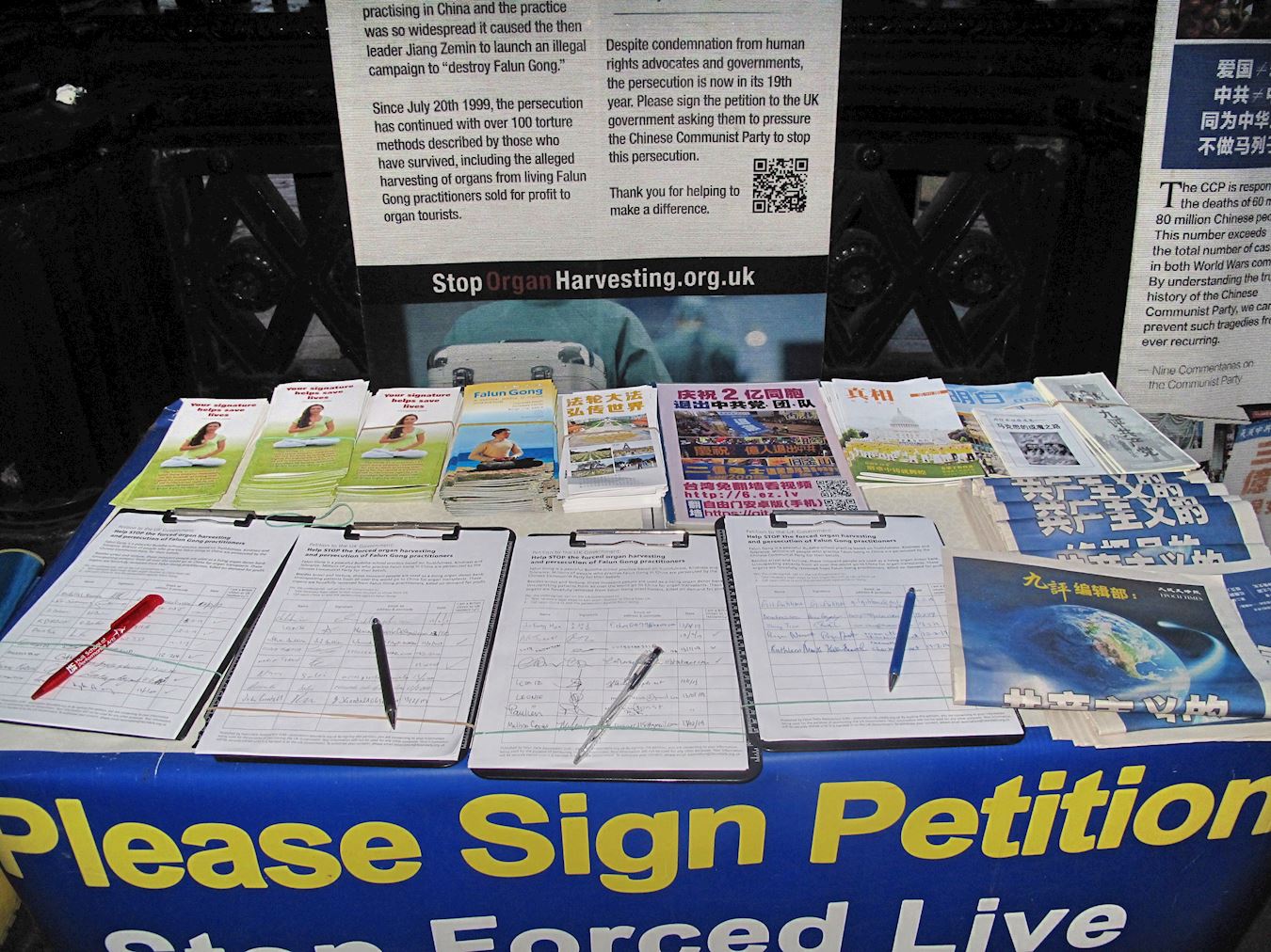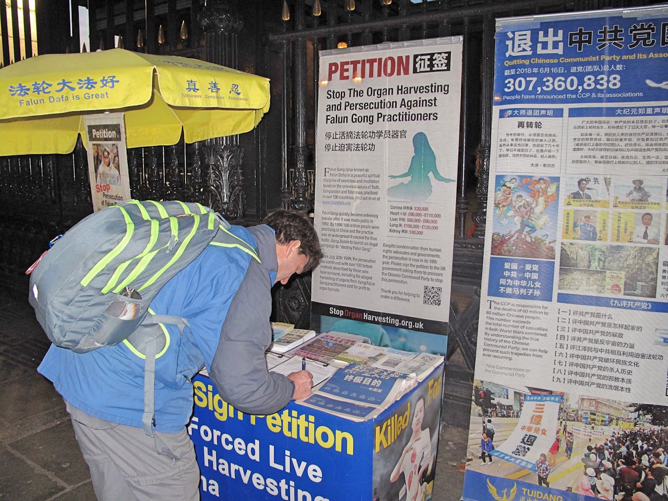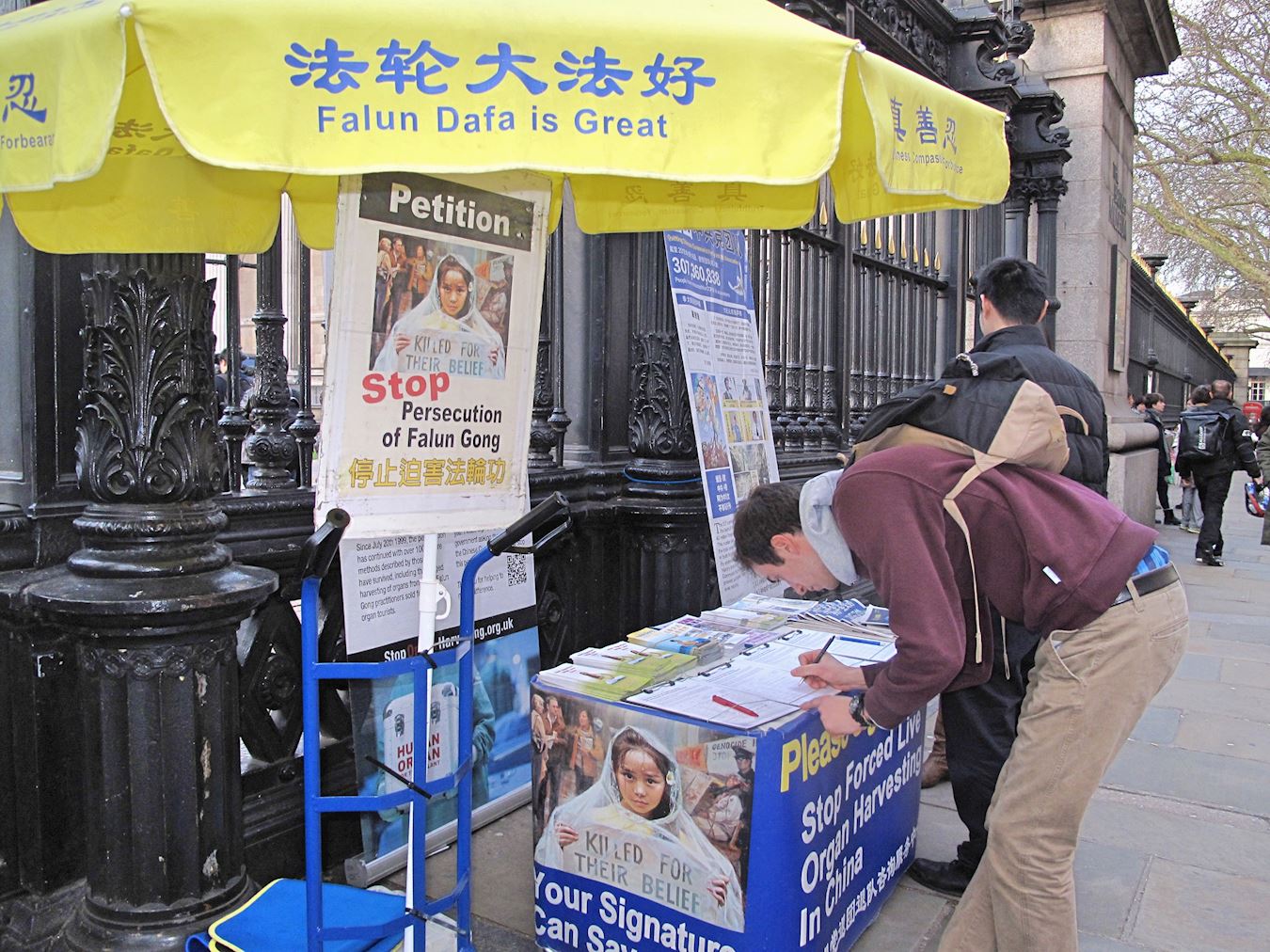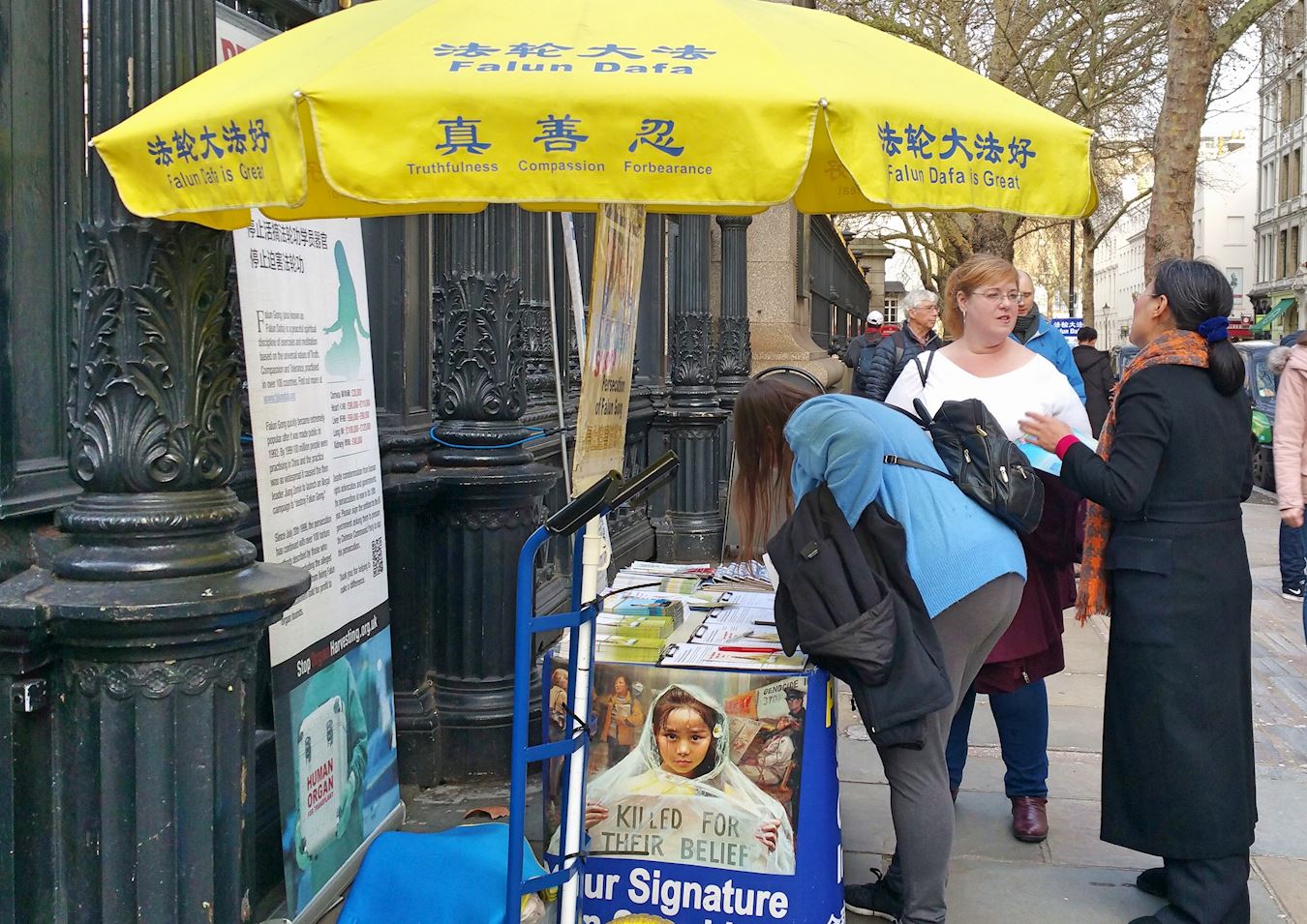两位刚从大英博物馆出来的美国游客驻足观看揭露中共活摘罪行以及呼吁反迫害展板后,径直走到桌前签名要求停止迫害。其中一位女士表示:“不该让(中共活摘法轮功学员器官)这样的事情在人类发生,必须制止。”