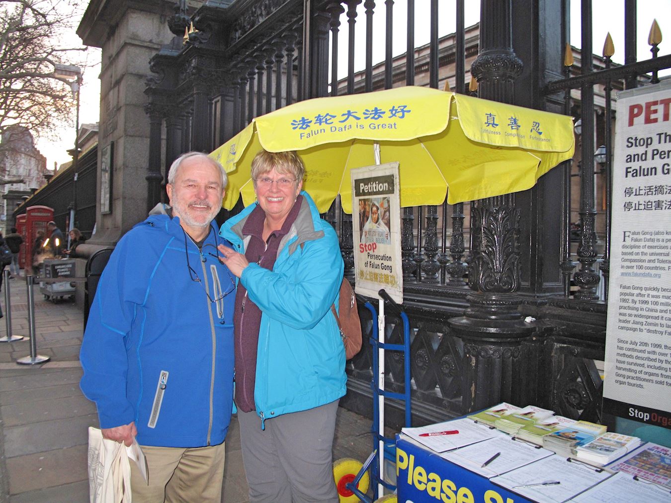 ![]() 图7:二零一九年二月十三日,来自美国密西根州的社会学教授罗杰(Roger)和做中学教师的太太凯西(Cathy)在大英博物馆门前签名支持法轮功反迫害。 |