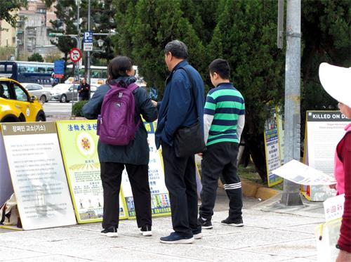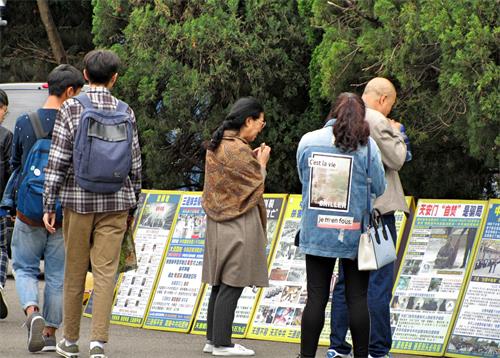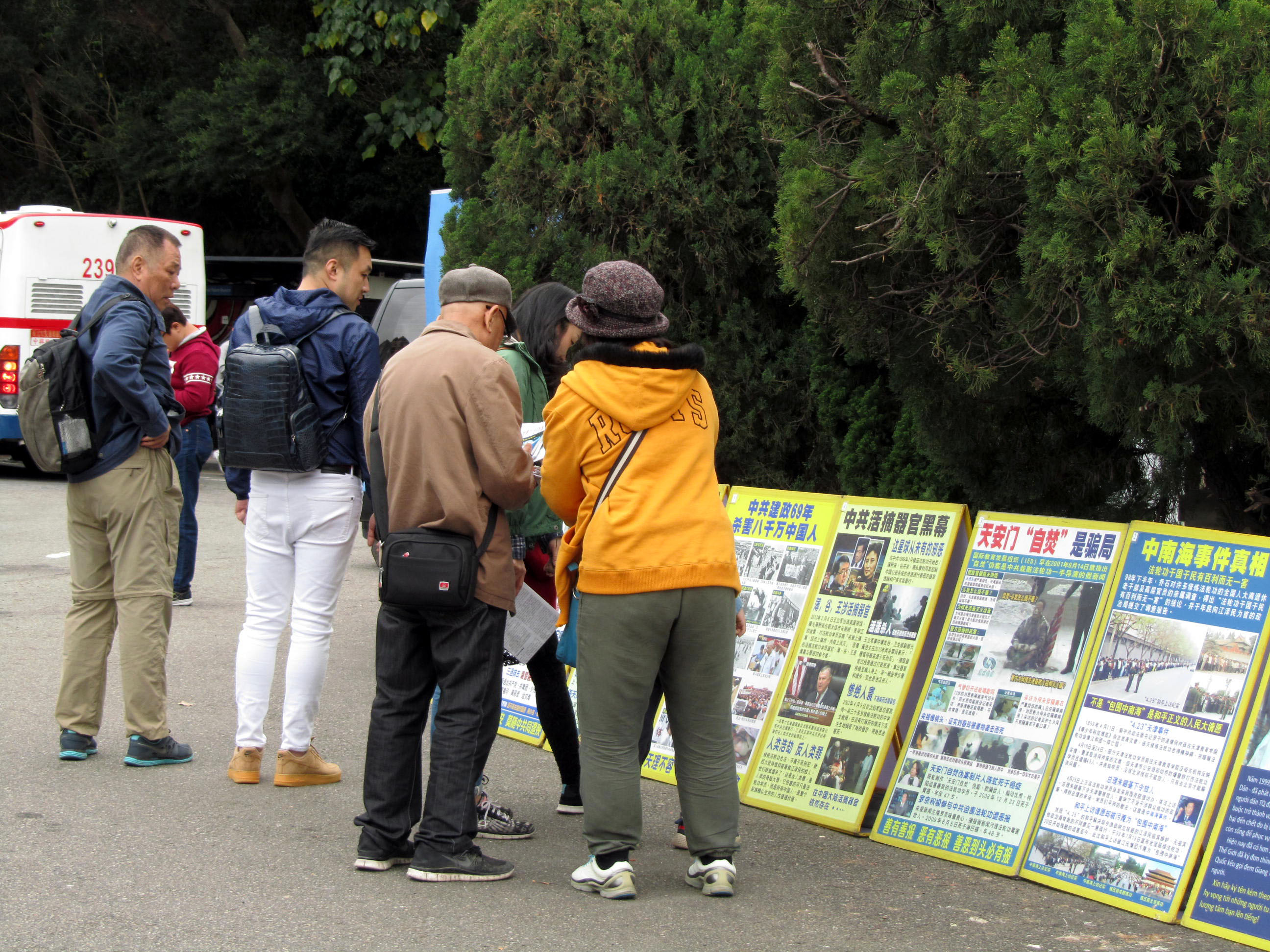 熙来攘往的游客,有的驻足展板前观看真相内容,有的手指着特别关注的真相与同伴分享或讨论,有的从学员手中接过真相报导认真阅读,有的聆听学员讲真相,许多明白真相的中国游客,请学员帮他们声明三退(退出中共党、团、队,简称三退),也有不少人,早已上网三退,或在家乡接获法轮功学员的电话,明白真相后已经三退,匆匆一走一过之间,拿起手机拍摄展板上的真相,表示要带回去与亲朋好友分享。