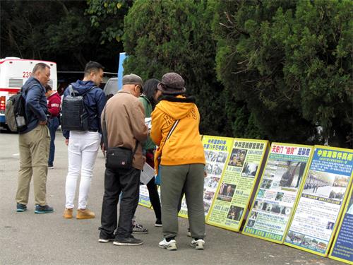 故宫院区前面,宽广空地的左右两侧,分别植栽翠绿的树木围篱,区隔大小车辆接送旅客时临停,以及旅客步行或停留区域的界线。挨着青翠的树篱笆,排列着法轮功的真相展板,印证法轮大法弘传世界、在各地受到欢迎和褒扬的盛况;揭露中共残酷迫害、活摘器官等恶行;以及全球声援中国民众控告罪魁祸首并要求法办迫害元凶的真相。在展现法轮大法的美好的同时,也揭露中共无理迫害的邪恶本质,天灭中共、恶人遭报的必然。