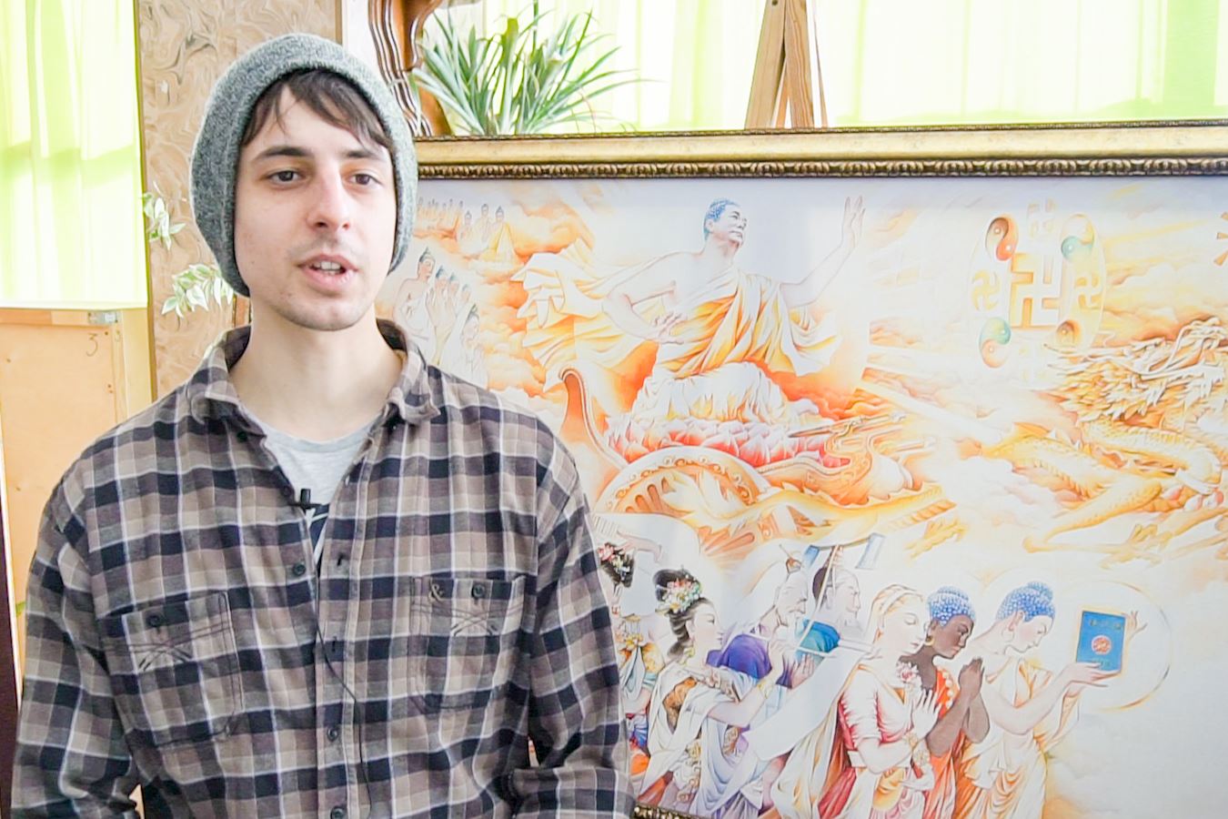 演员阿尔乔姆(Artyom)分享到:“我非常喜欢这个展览,充满了丰富的情感!建议所有人都来参观!每一幅画都有一些内在意义。这些话题涉及善良、邪恶、关于神、关于转世、关于我们在社会中生存时的行为、好的坏的。这张画表现了三界:天、地和地下世界,具体表达了善和恶。如果一个人是虚荣、嫉妒的,那么他自然下一个转世会落入最低生命层次。如果一个人做善事、修炼自己、不嫉妒任何人,一个相信神的善良的人,那么,自然在下一生中他将去更高的生命层次。”